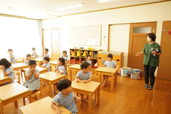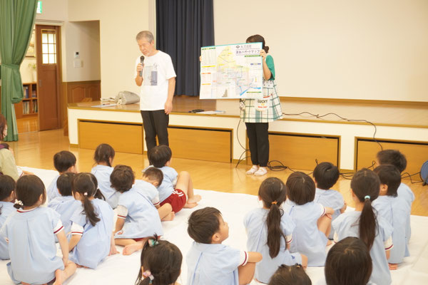 9月1日は「防災の日」です。海の星保育園でも水害を想定した防災訓練を行いました。近年では、各地で地震や火事、水害など自然災害に見舞われています。だからこそ、今一度「防災」についてハザードマップやプロジェクターを用いてお話を聞き、丁寧に考えて学ぶことができました。いつかくるかもしれない``もしも‘‘の時に備え「安全に非難する」為に命を守るための大切な行事の一つとなっています。今回も放送をよく聞いて、慌てることなくスムーズに避難することができましたよ♪