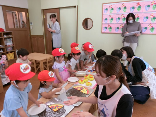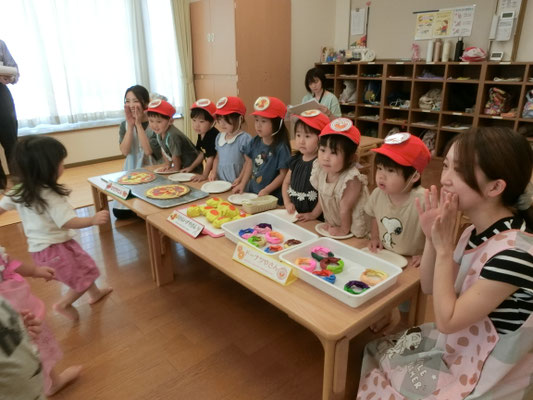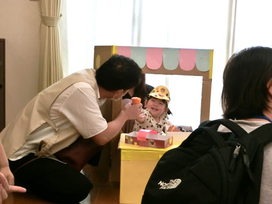 たくさんの先生方が来られましたが、緊張することなく普段通りの元気な姿が見られました。「いらっしゃいませ」や「これください」など友だちと言葉のやり取りを楽しんで遊ぶことができました。頂いたアドバイスを今後の保育に生かしていきたいと思います。