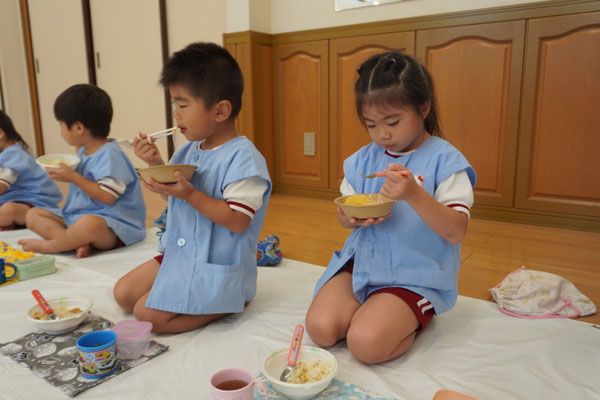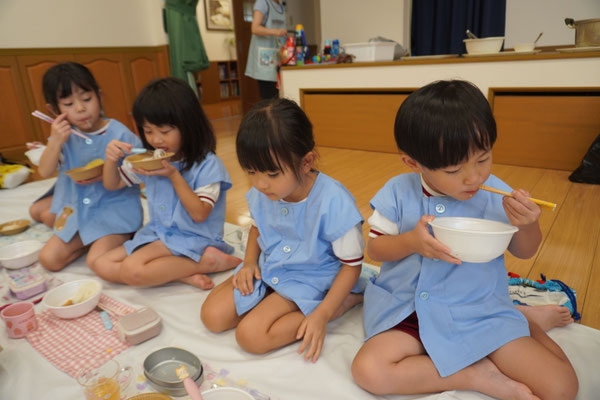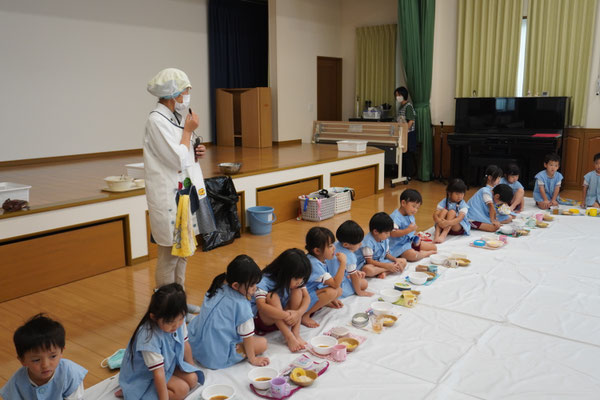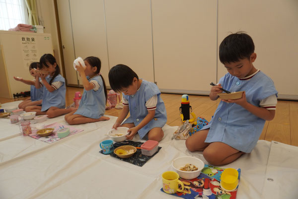 保育中に水害でライフラインが使えず、給食が提供できないことを想定した非常食体験を今年も行いました。給食やお家で食べている温かいご飯は当たり前のものではなく今回の経験を通して改めて感謝の気持ちを持って毎日の食事を楽しんでもらえると嬉しいです♪