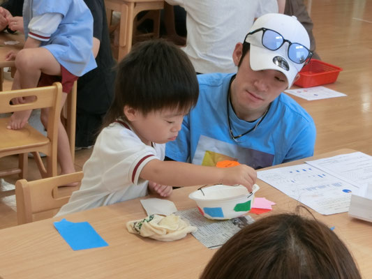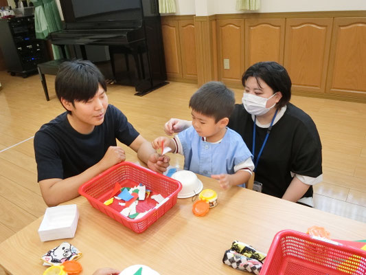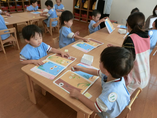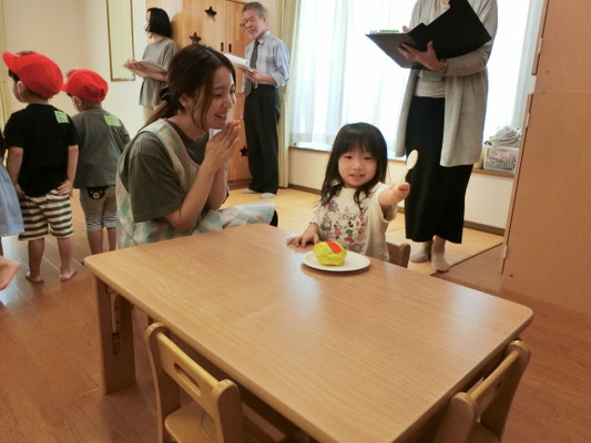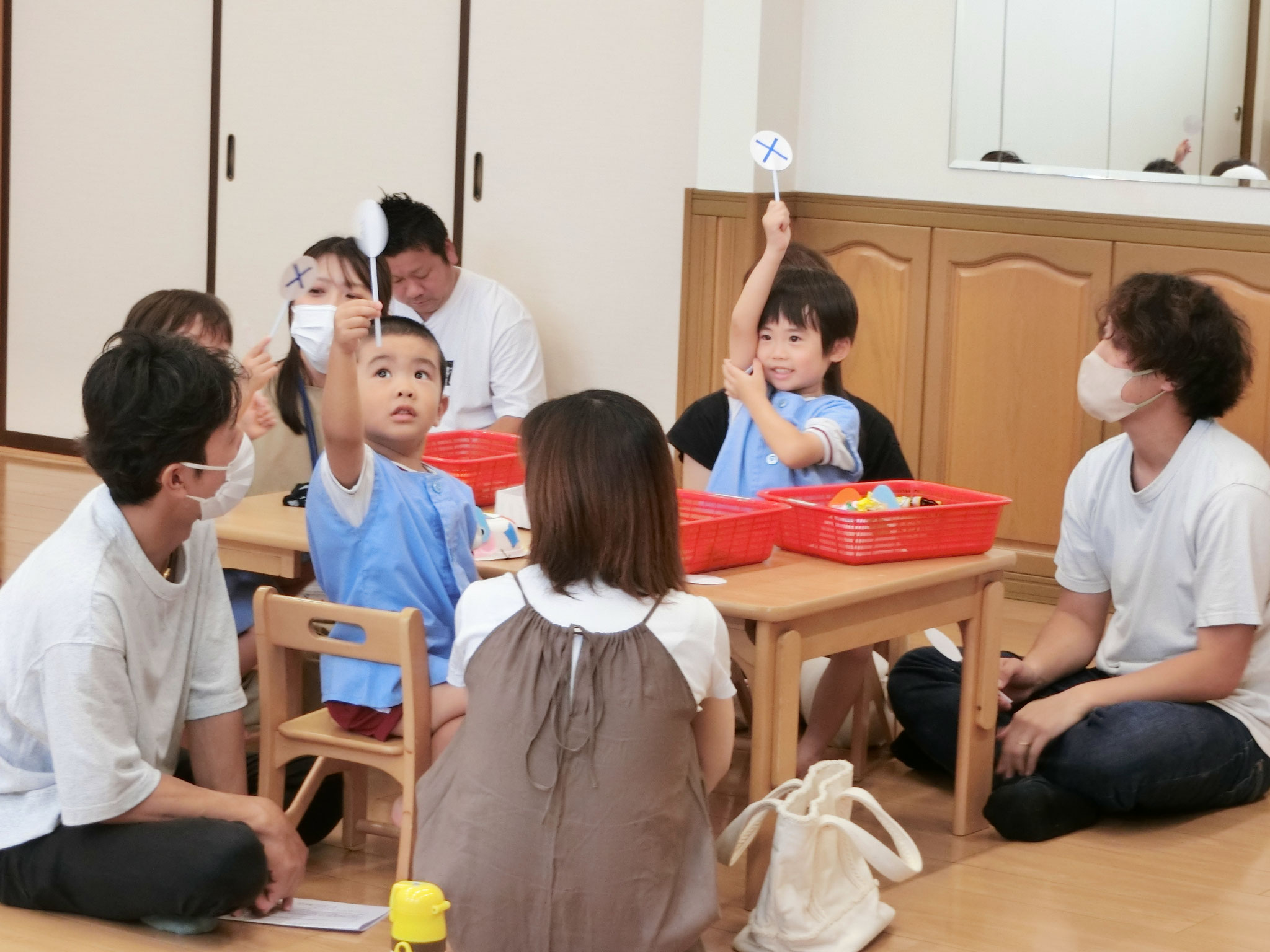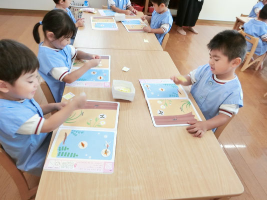 緊張することなく、いつもと変りなく過ごすことができました。学習遊びでは、生き物のシールを自分で考えて貼り、それぞれの世界観を友だちに発表することで楽しく活動に取り組むことができました。頂いたアドバイスを今後の保育に生かしていきたいと思います。