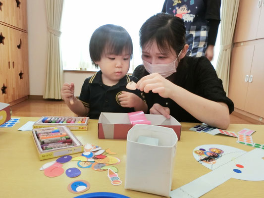 楽しみにしていた保育参観!普段の午前中の活動を親子で一緒に過ごしていただきました。登園後、いつもと違う雰囲気に緊張していた子ども達。何曲か季節の歌を楽しむうちに、少しずつ緊張もほぐれ、親子製作では嬉しそうに笑顔を見せ、シール貼りに集中してくれていました。最後のごっこ遊びでは友だちの名前を呼んだり、親子でお店屋さんのやりとりを楽しんだりと賑やかな様子でした♪