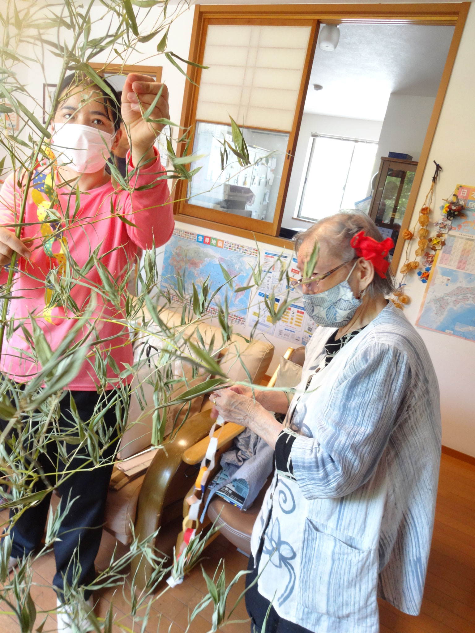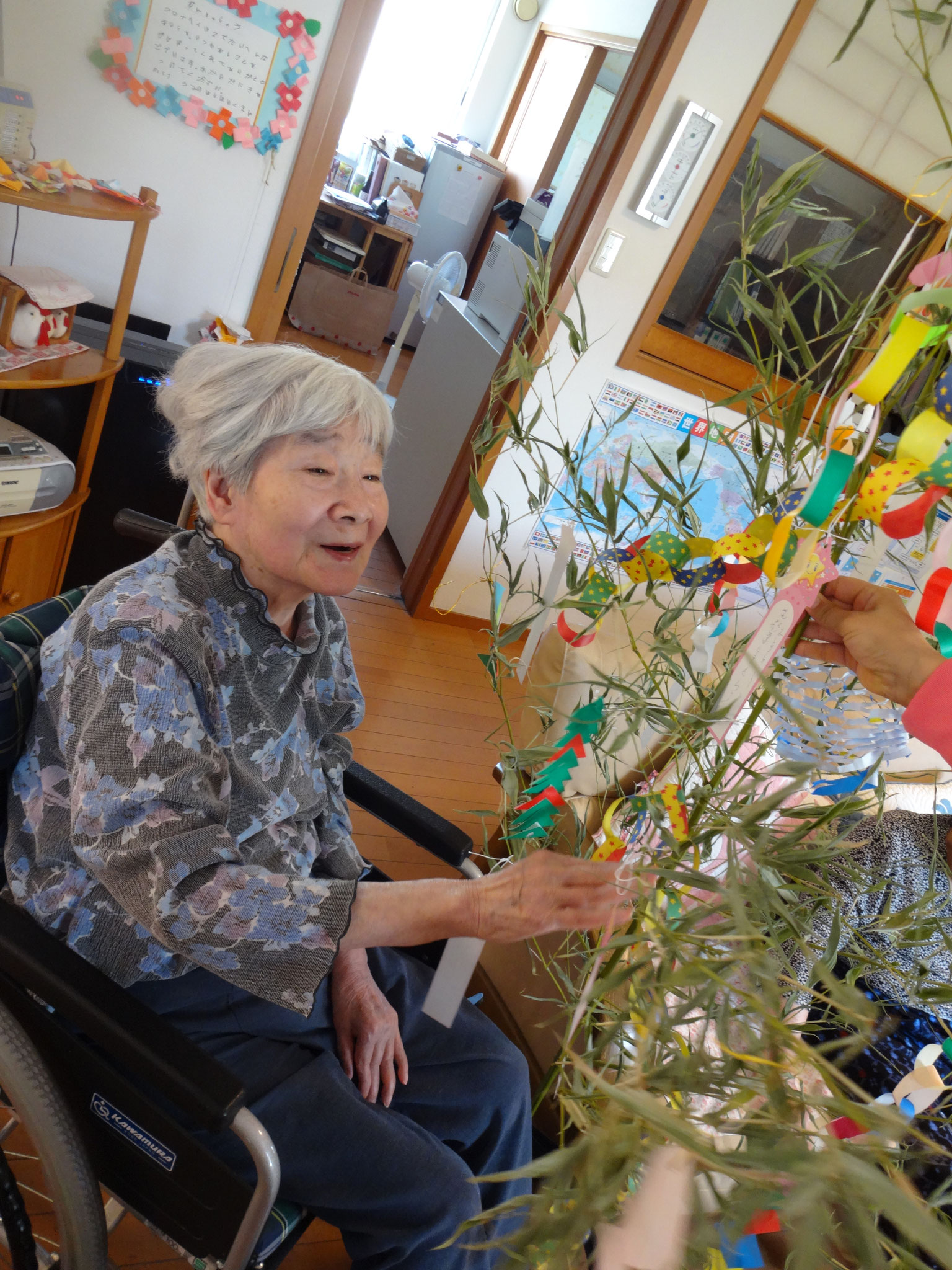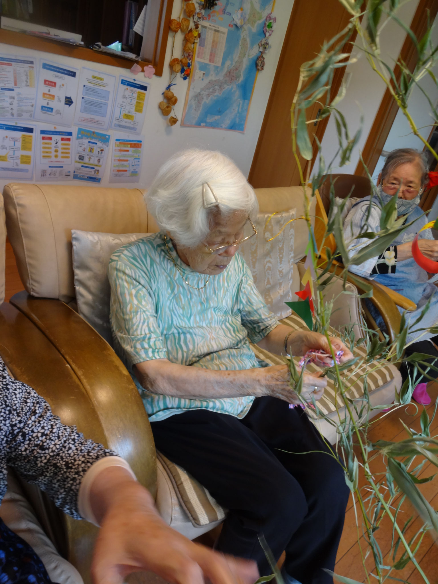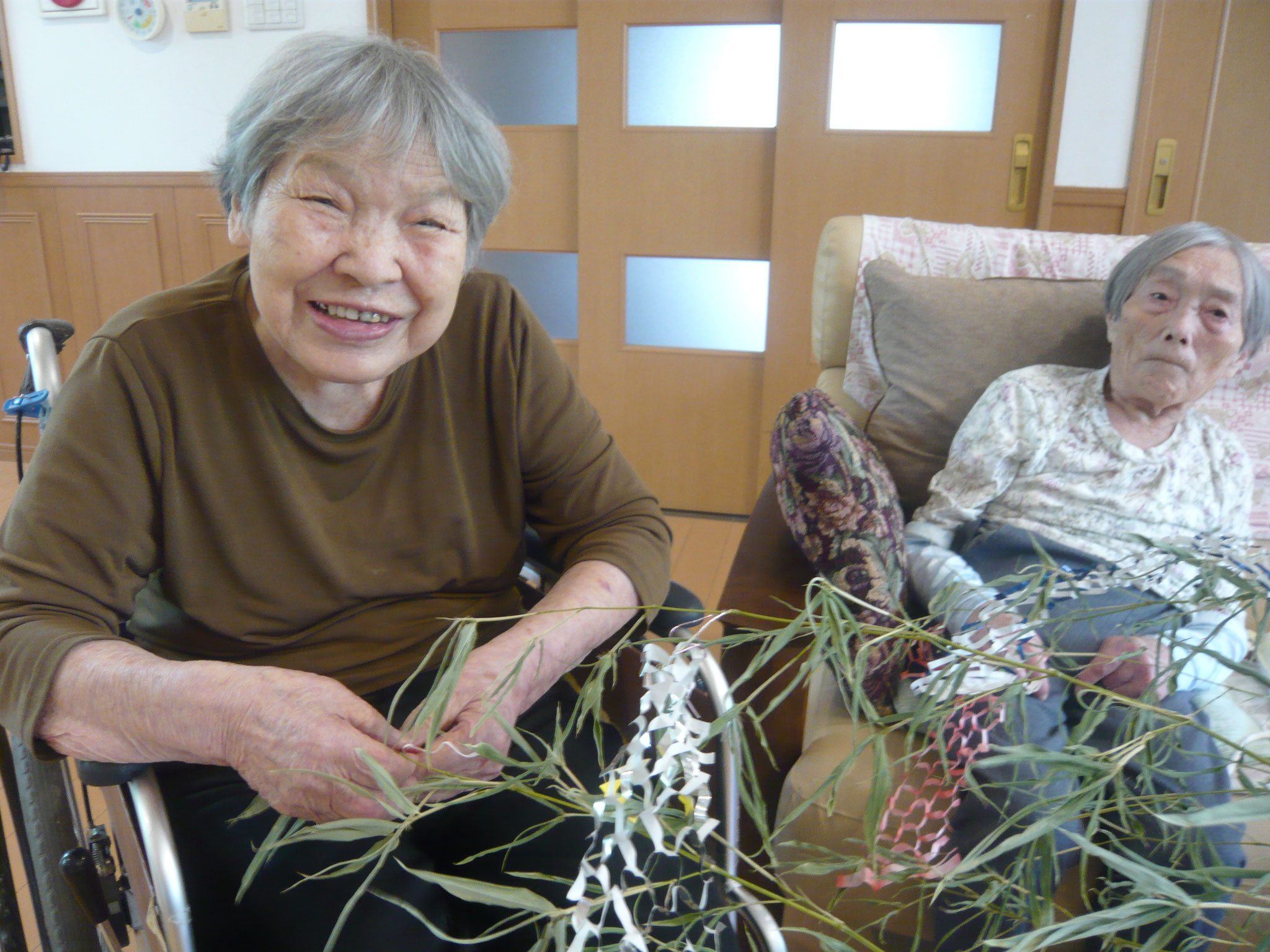 七夕の日には、みんなで短冊に願い事を書き、笹に飾り付けを行いました。「元気に過ごせますように」「おいしいものが食べられますように」と、それぞれの思いがこもった短冊が風に揺れていました。