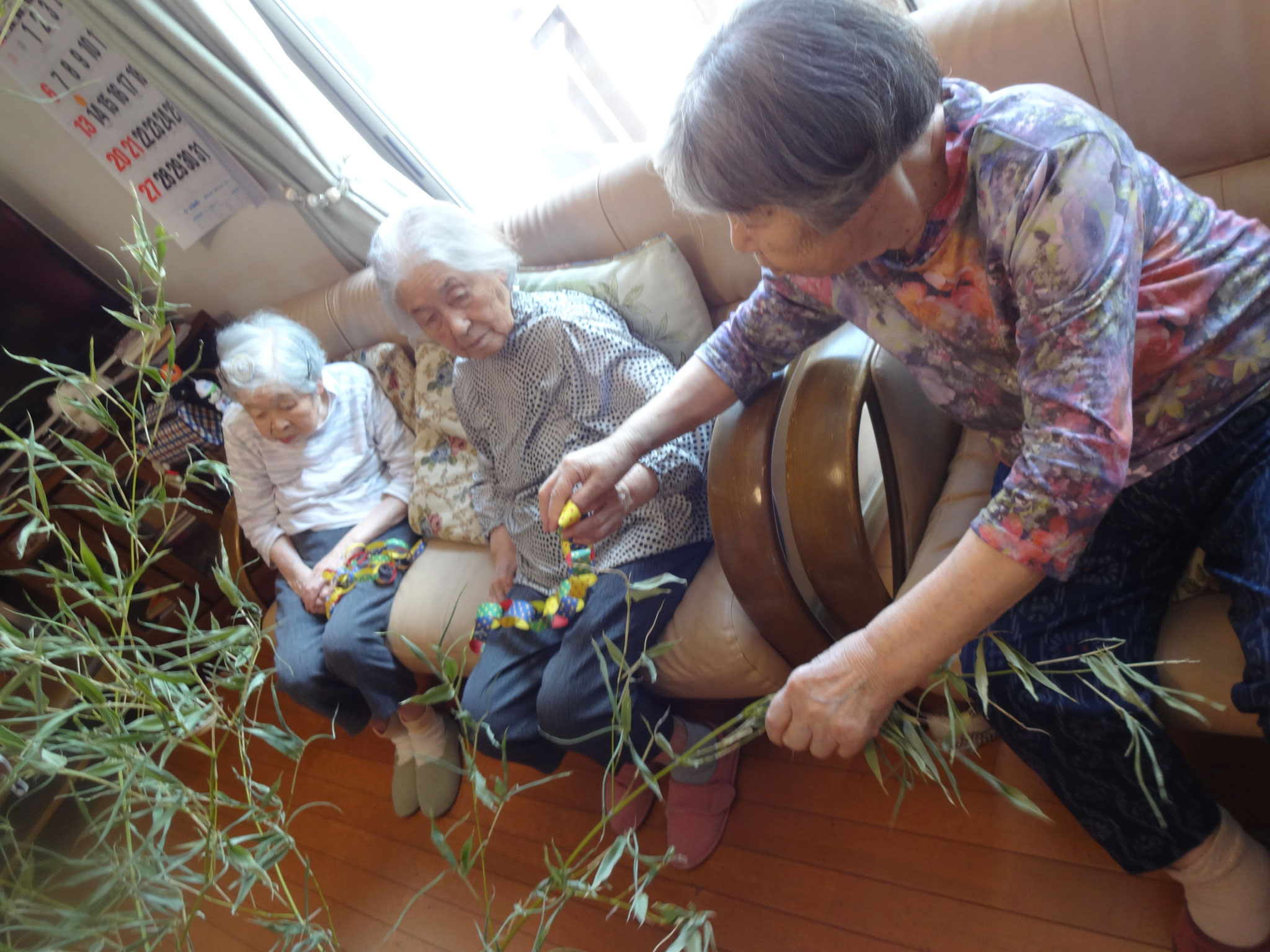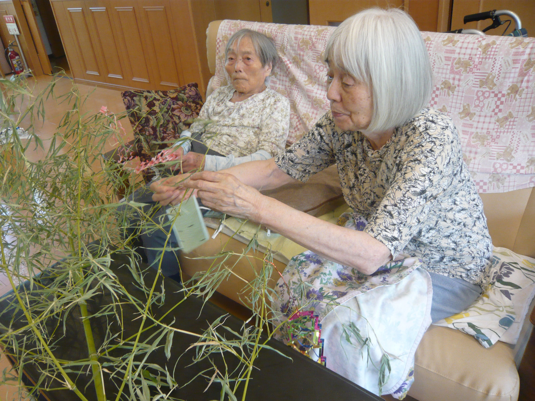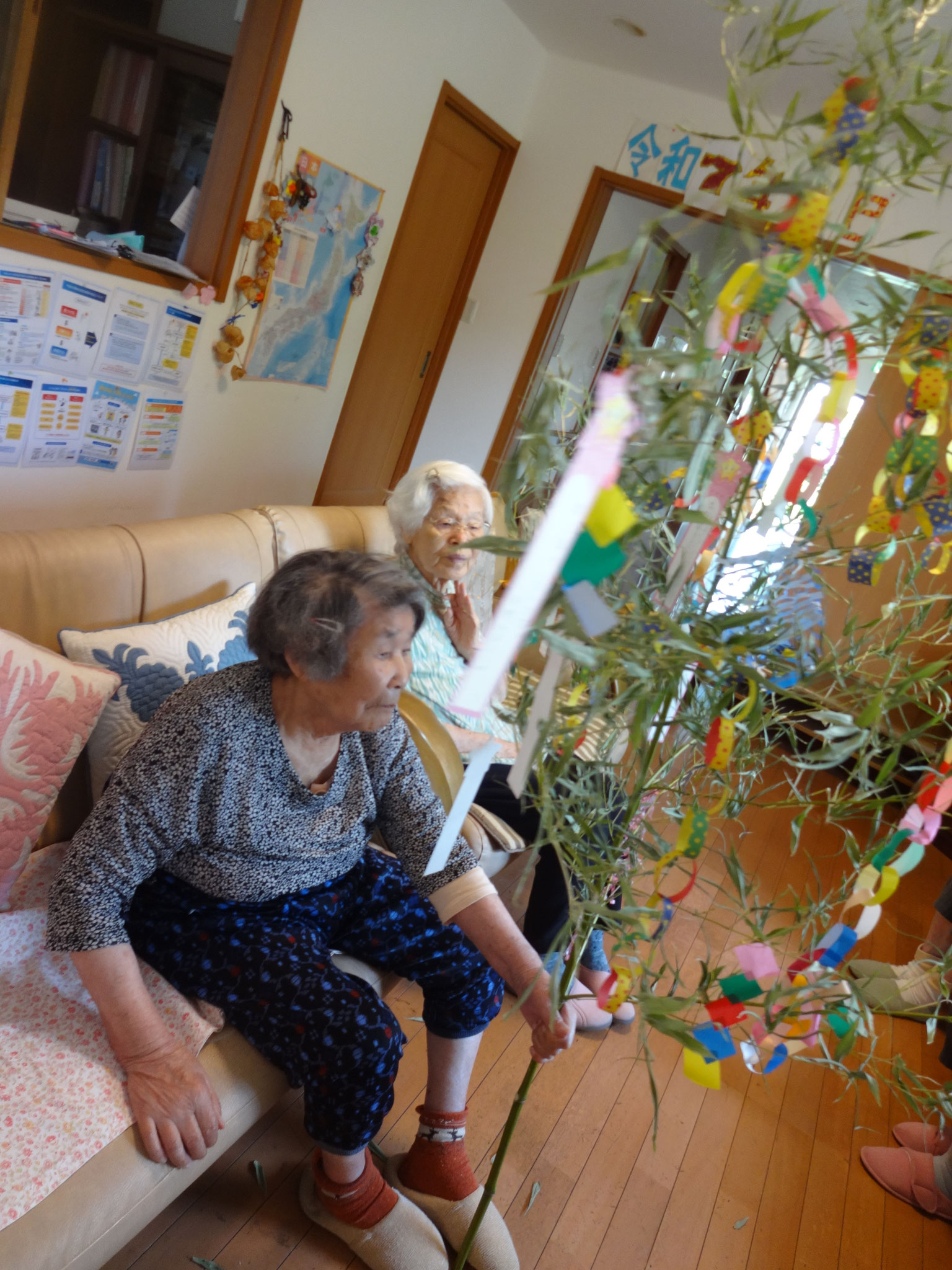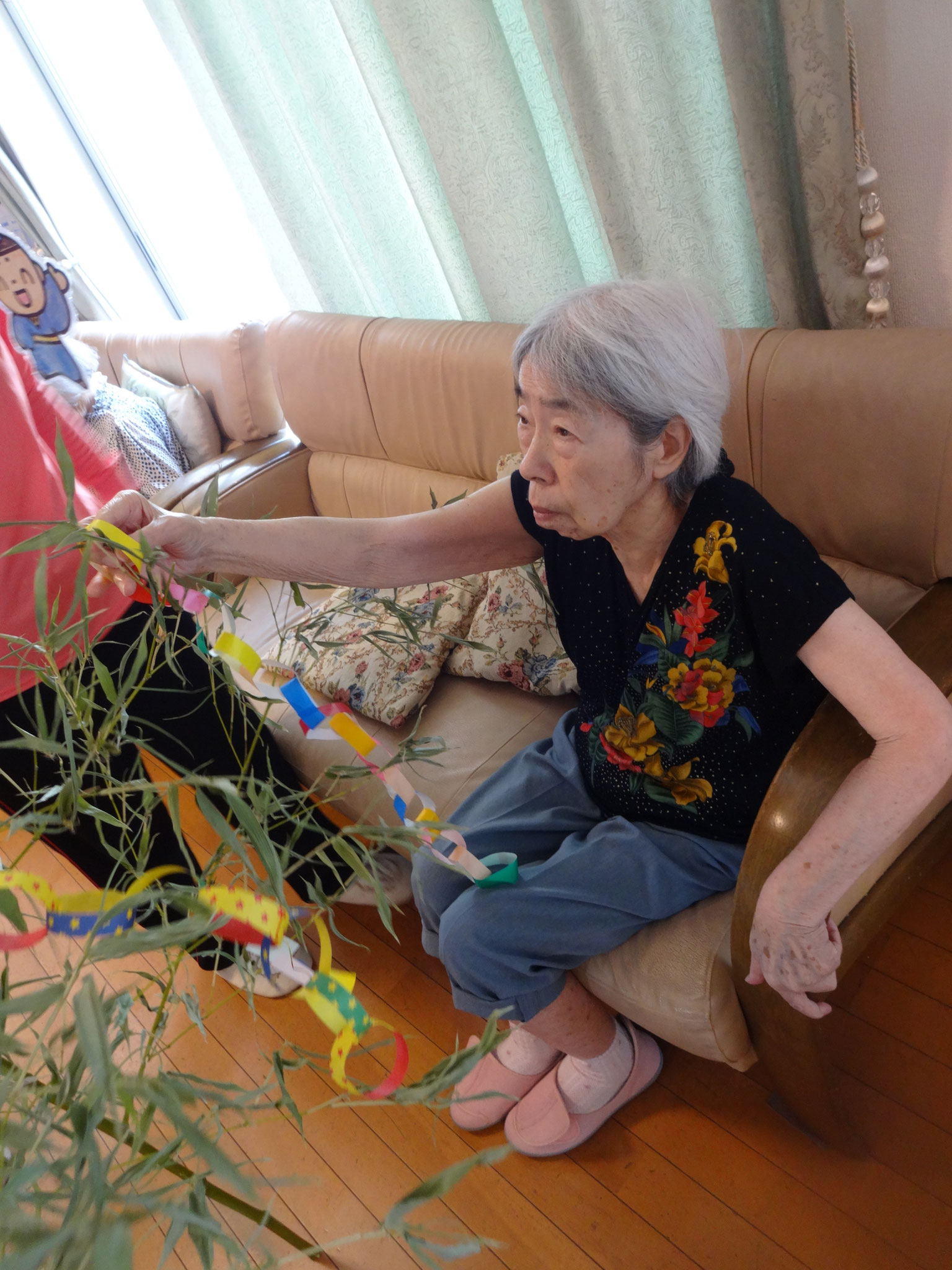 七夕の日には、みんなで短冊に願い事を書き、笹に飾り付けを行いました。「元気に過ごせますように」「おいしいものが食べられますように」と、それぞれの思いがこもった短冊が風に揺れていました。
