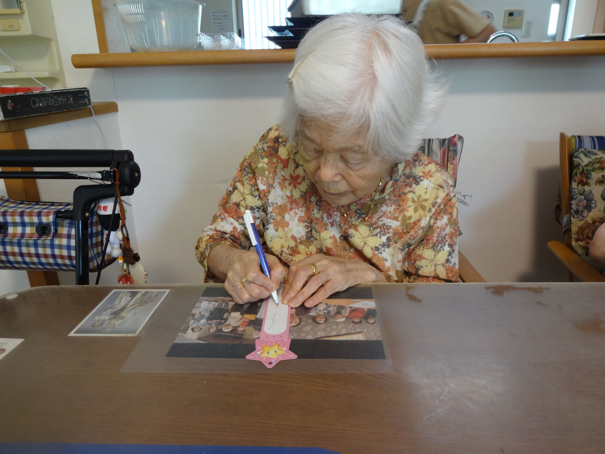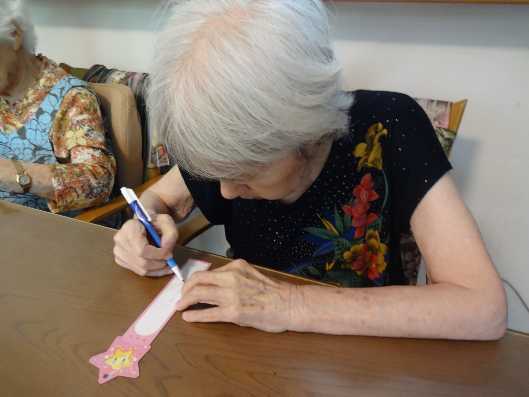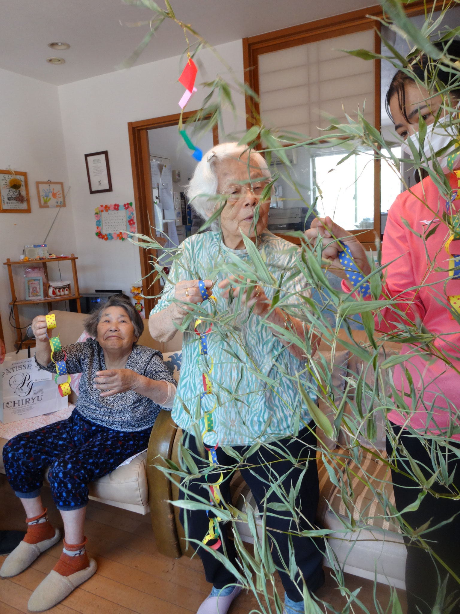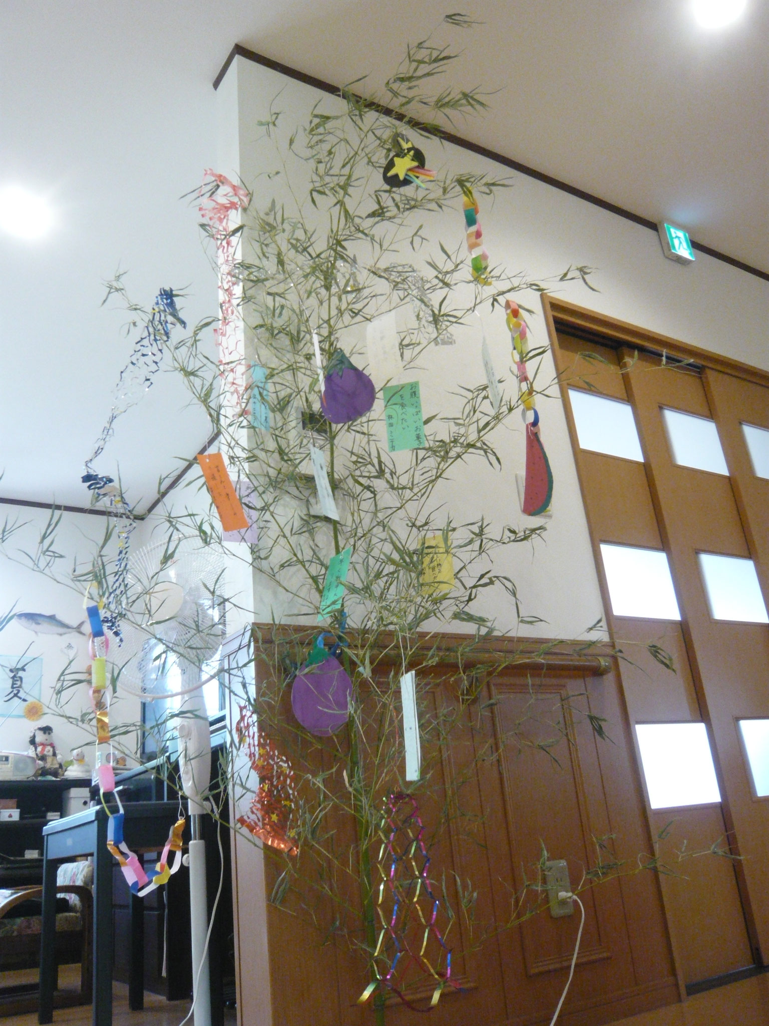 七夕の日には、みんなで短冊に願い事を書き、笹に飾り付けを行いました。「元気に過ごせますように」「おいしいものが食べられますように」と、それぞれの思いがこもった短冊が風に揺れていました。