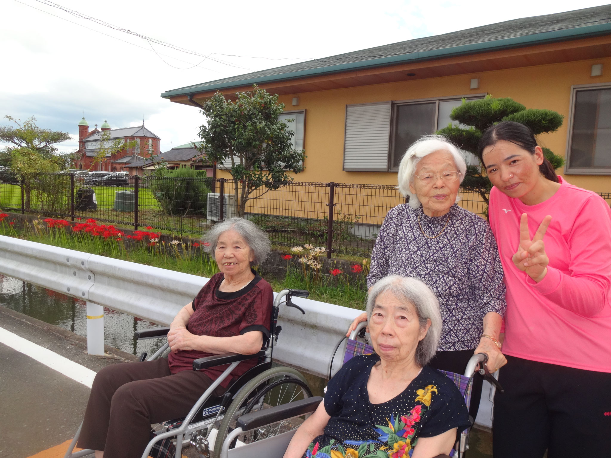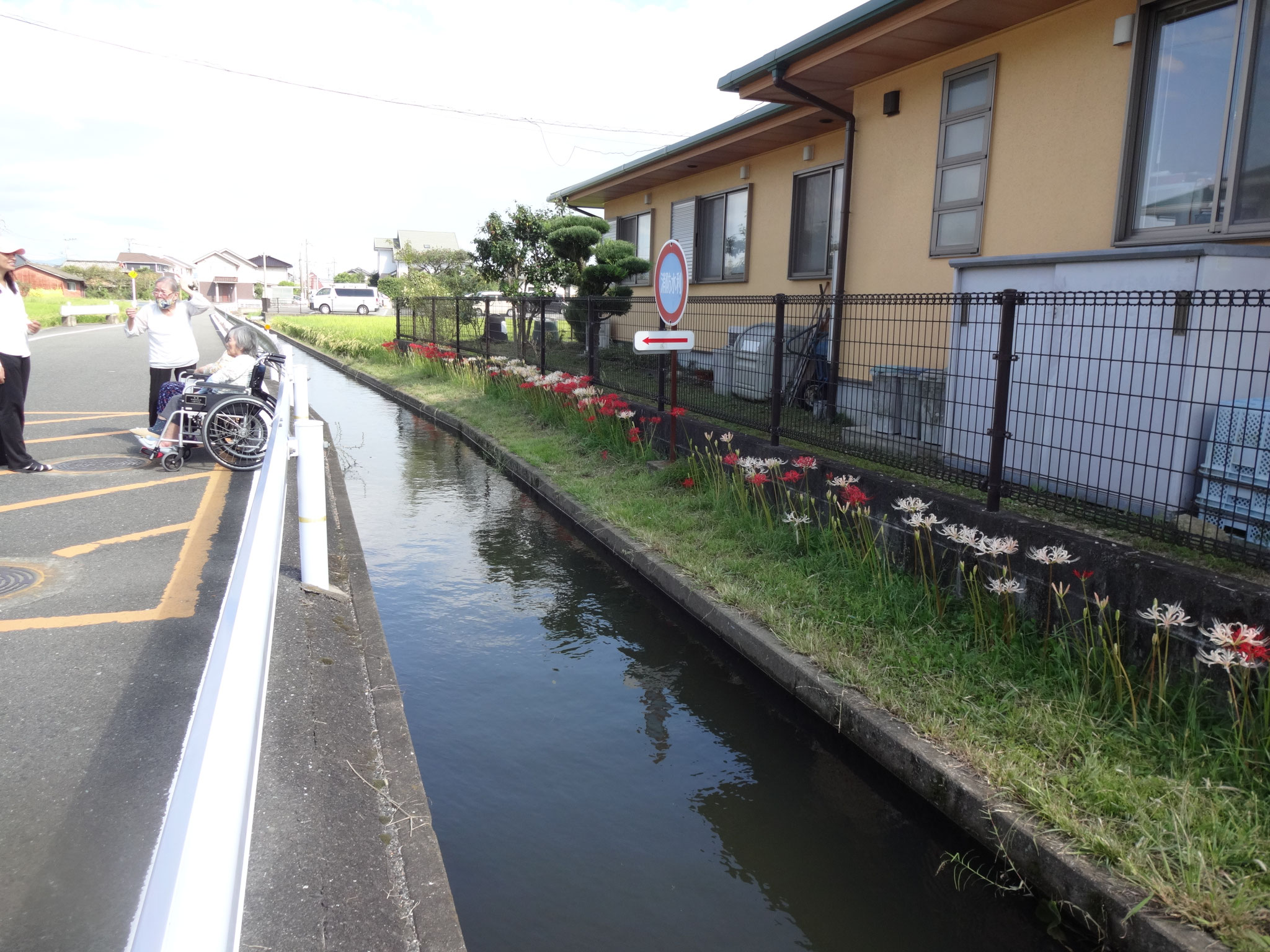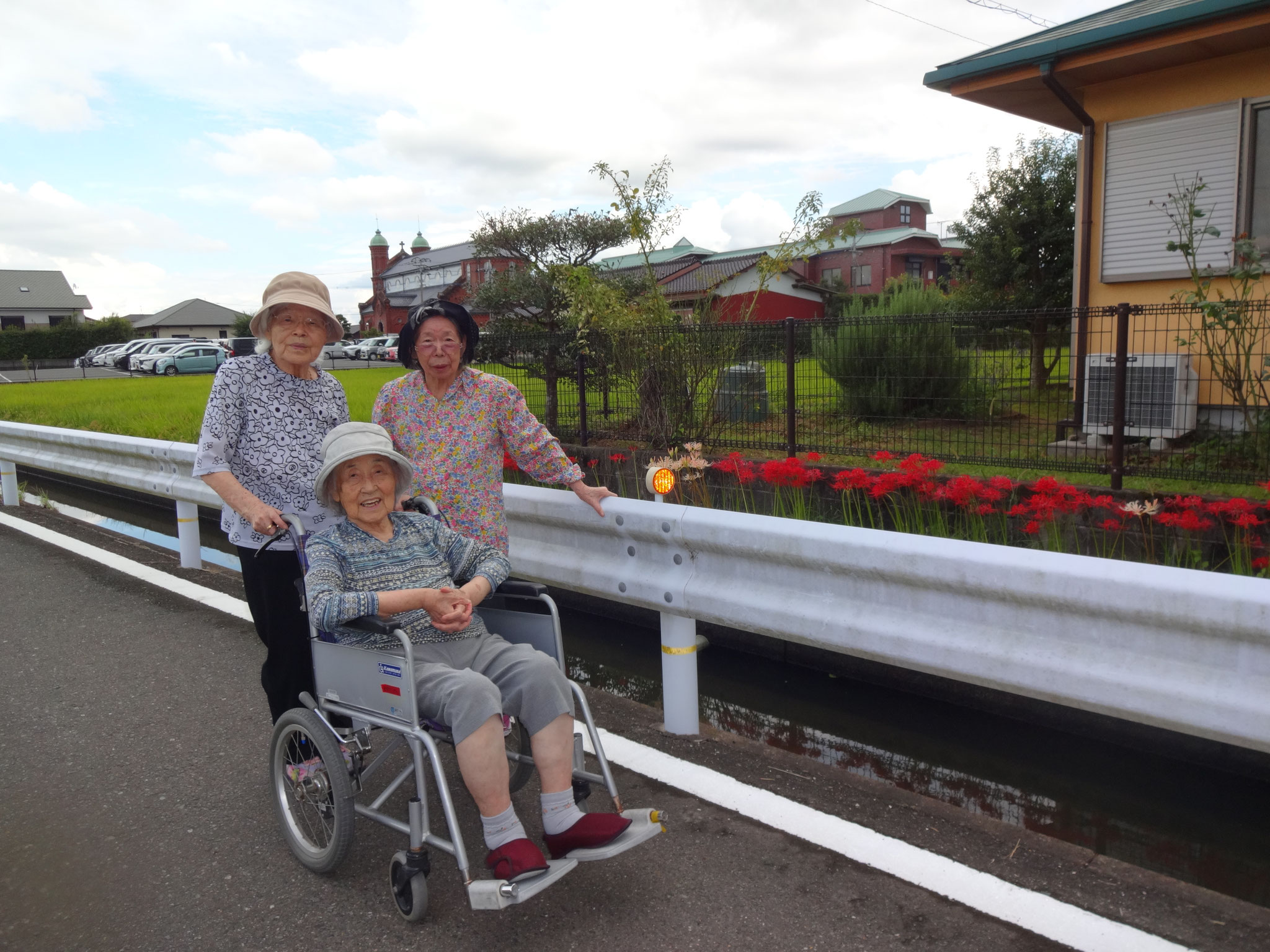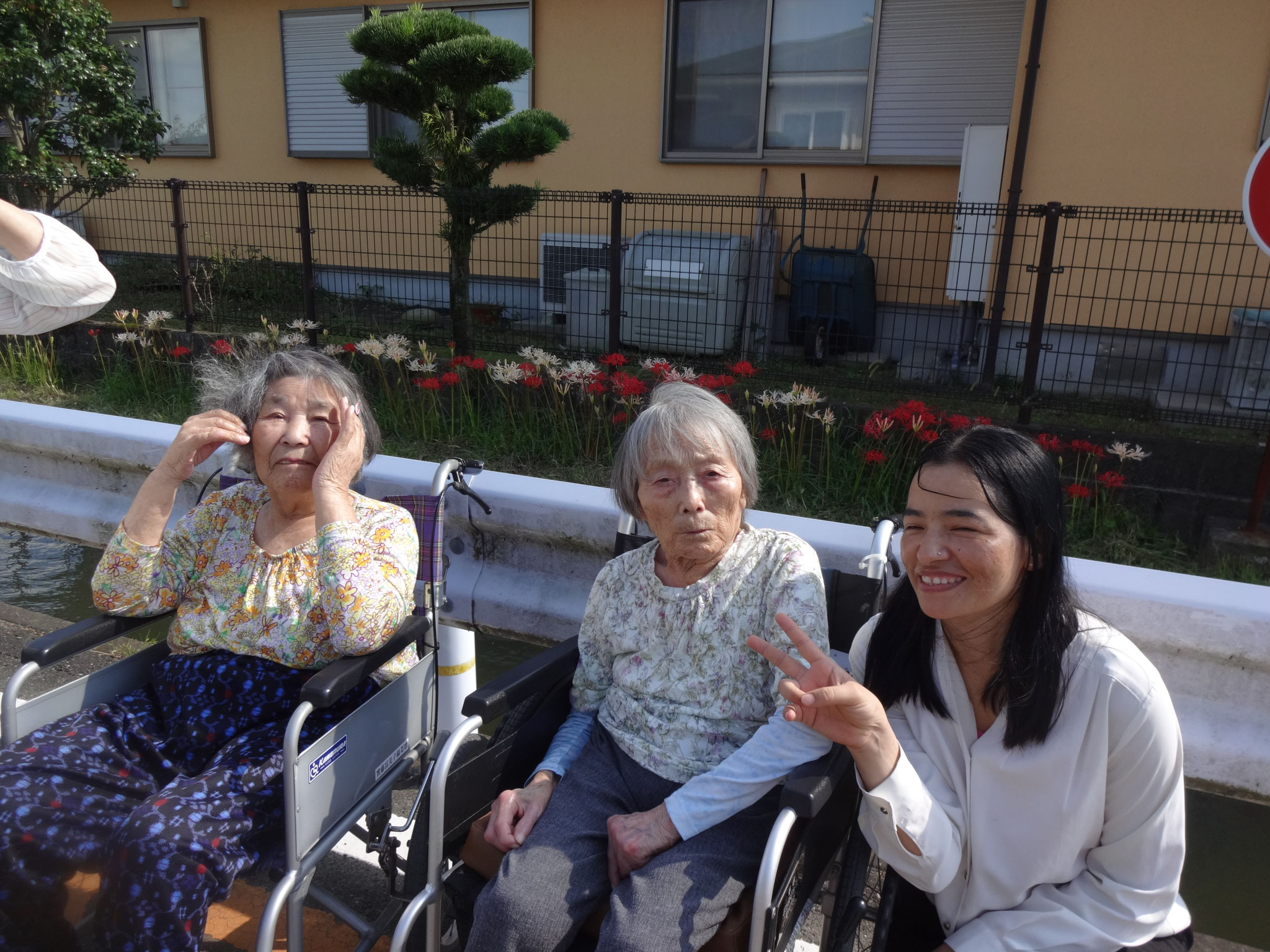 グループホームのすぐ横には、赤や白の彼岸花が美しく咲き誇ります。そこで、お散歩しながら皆さんと一緒に写真撮影を行いました。「きれいねぇ」「もう秋やねぇ」と、季節の移ろいを感じながら穏やかな時間を過ごしました。