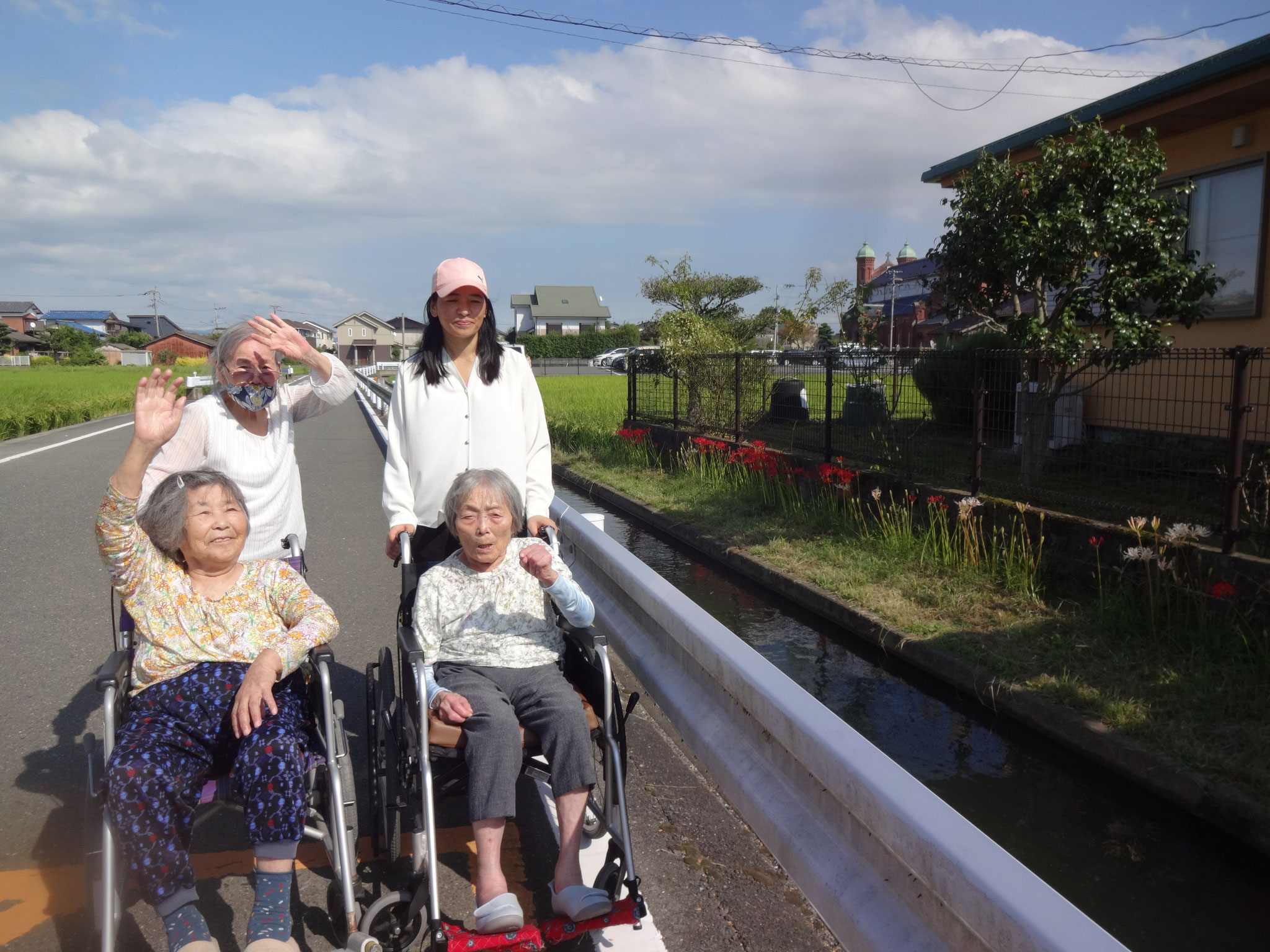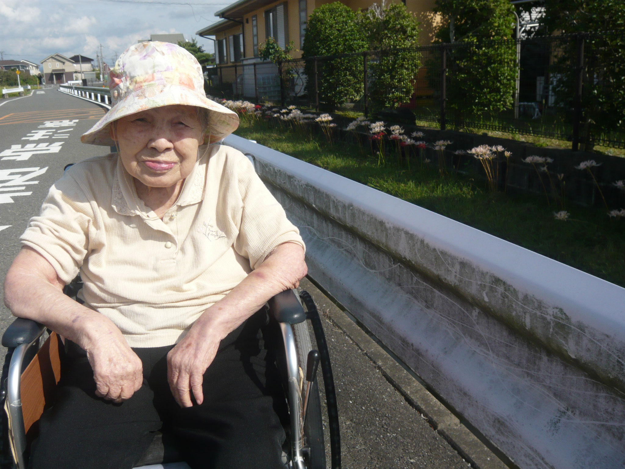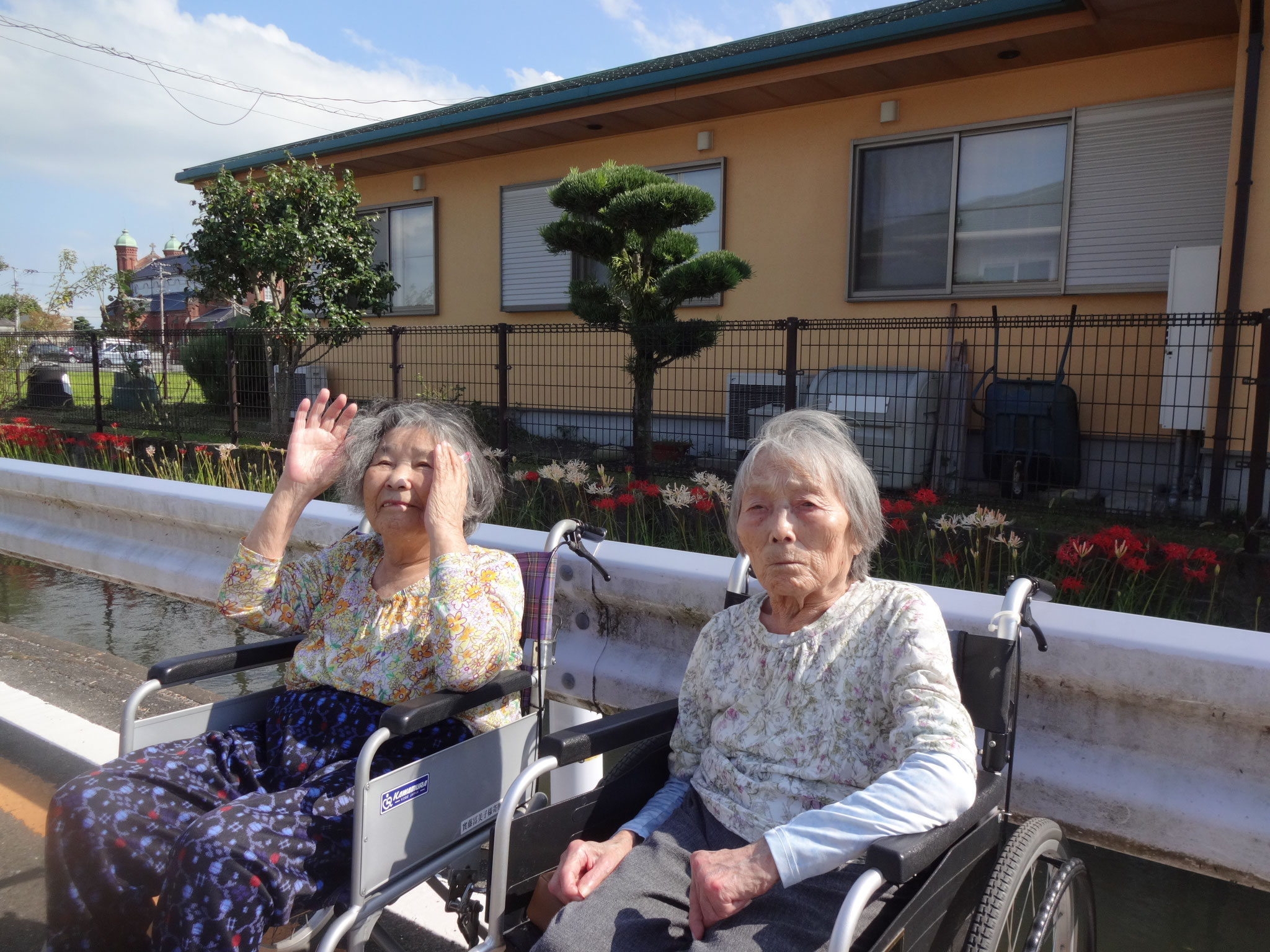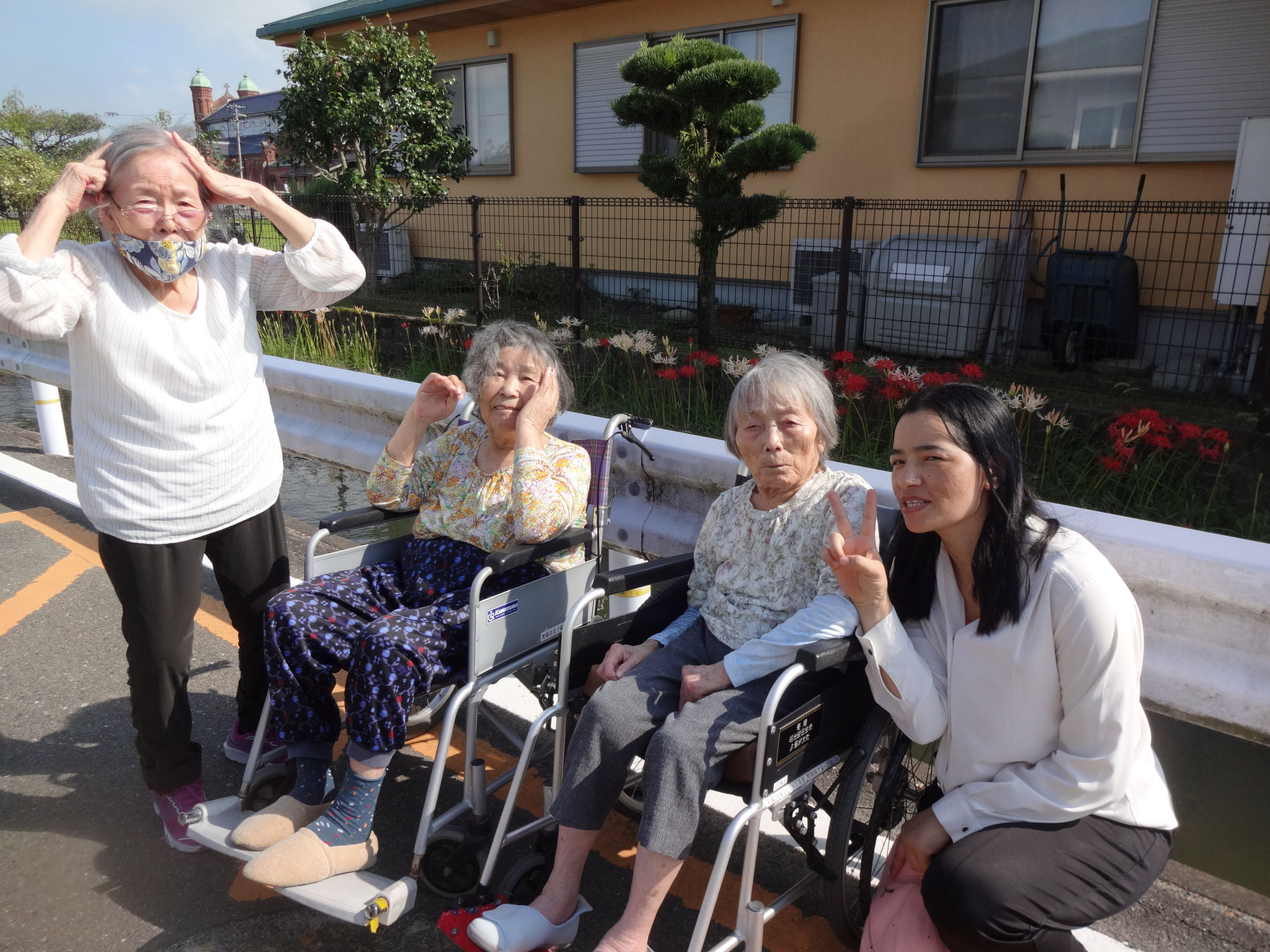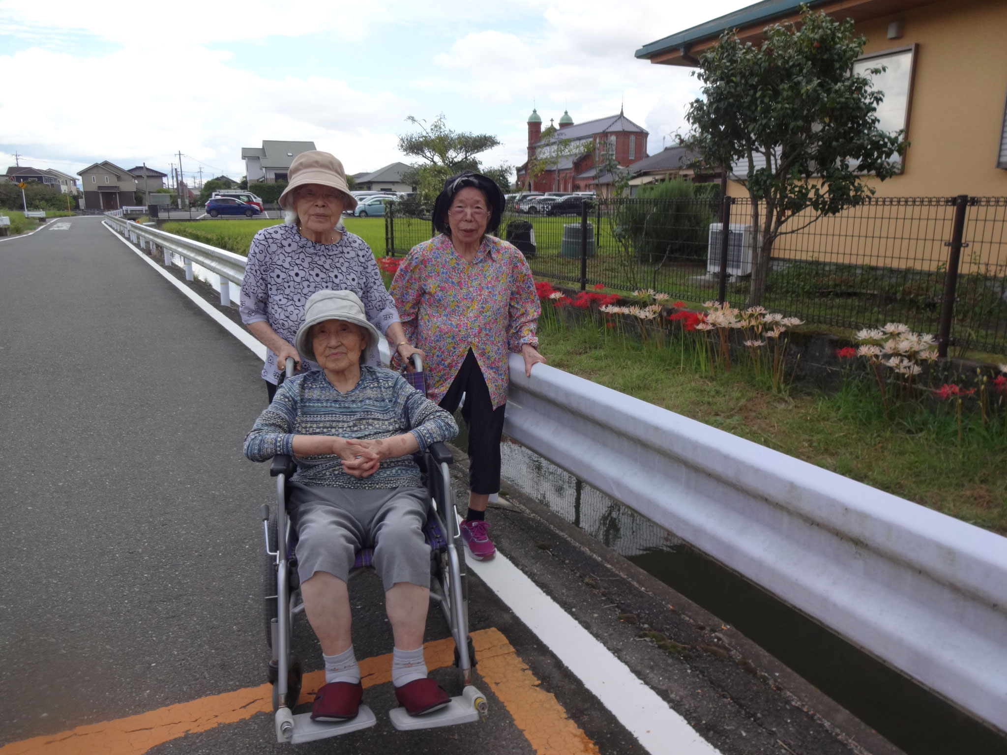 グループホームのすぐ横には、赤や白の彼岸花が美しく咲き誇ります。そこで、お散歩しながら皆さんと一緒に写真撮影を行いました。「きれいねぇ」「もう秋やねぇ」と、季節の移ろいを感じながら穏やかな時間を過ごしました。