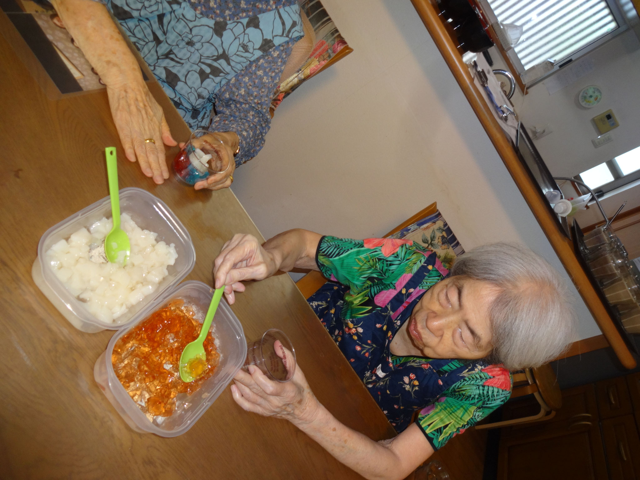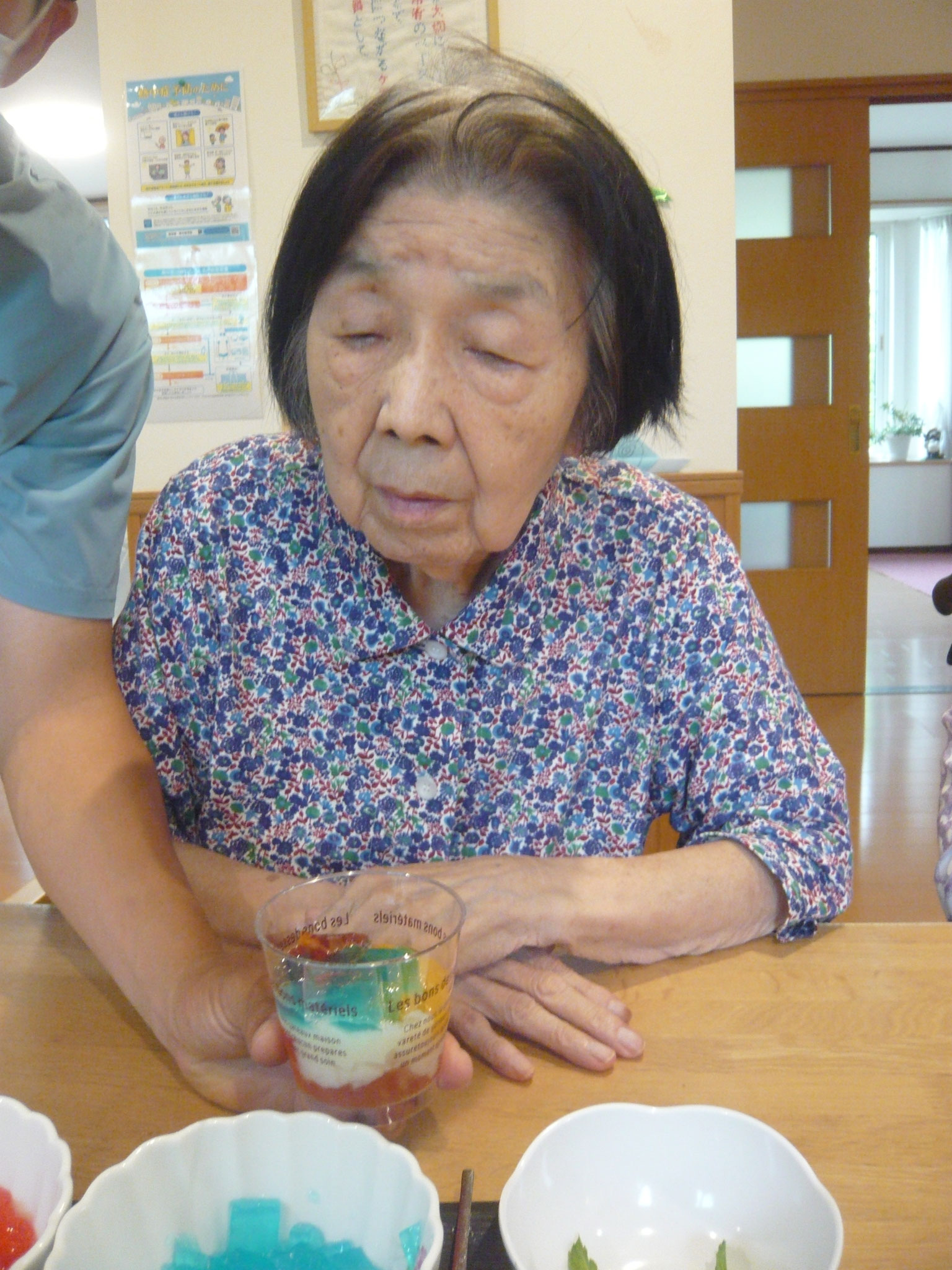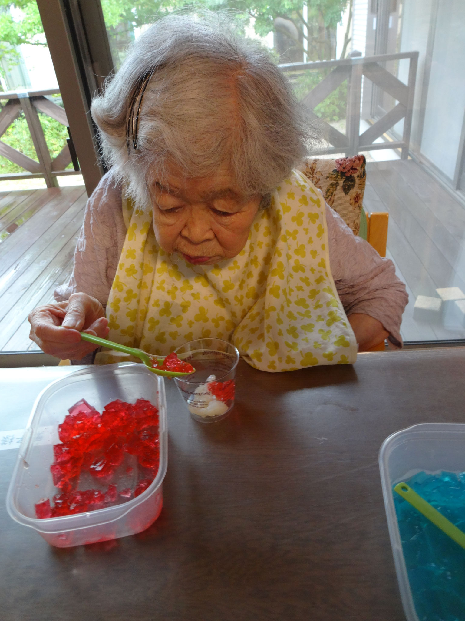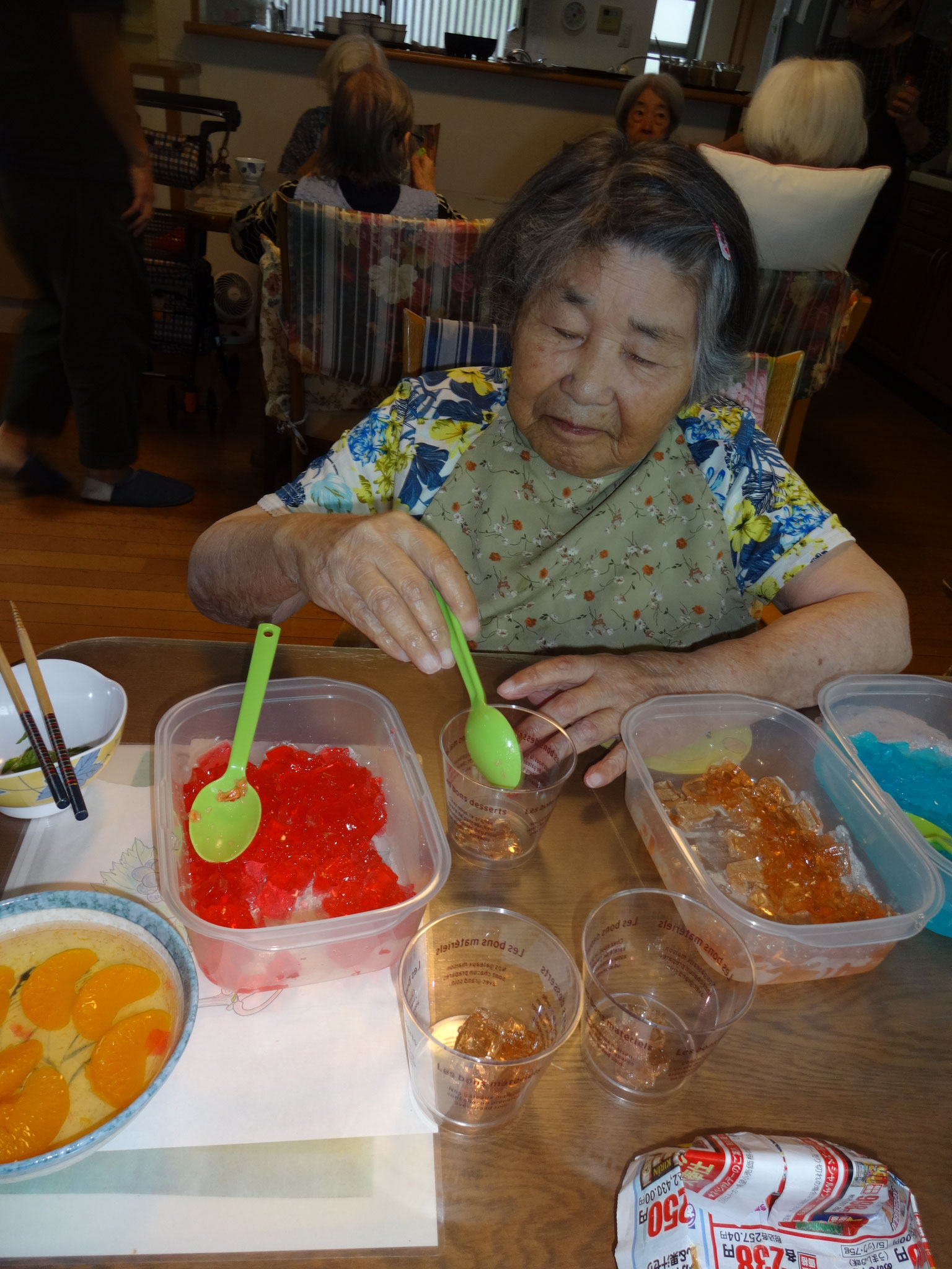 「この色、きれいね」「透き通っとるのが涼しか〜」と、楽しそうに材料を混ぜたり、型に流し込んだりしました。出来上がったゼリーは見た目にも涼しく、大好評でした。