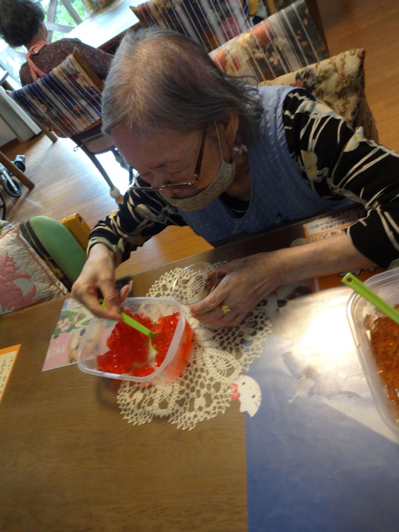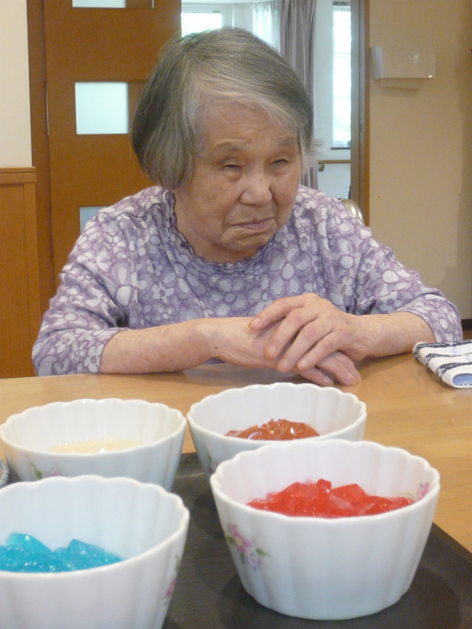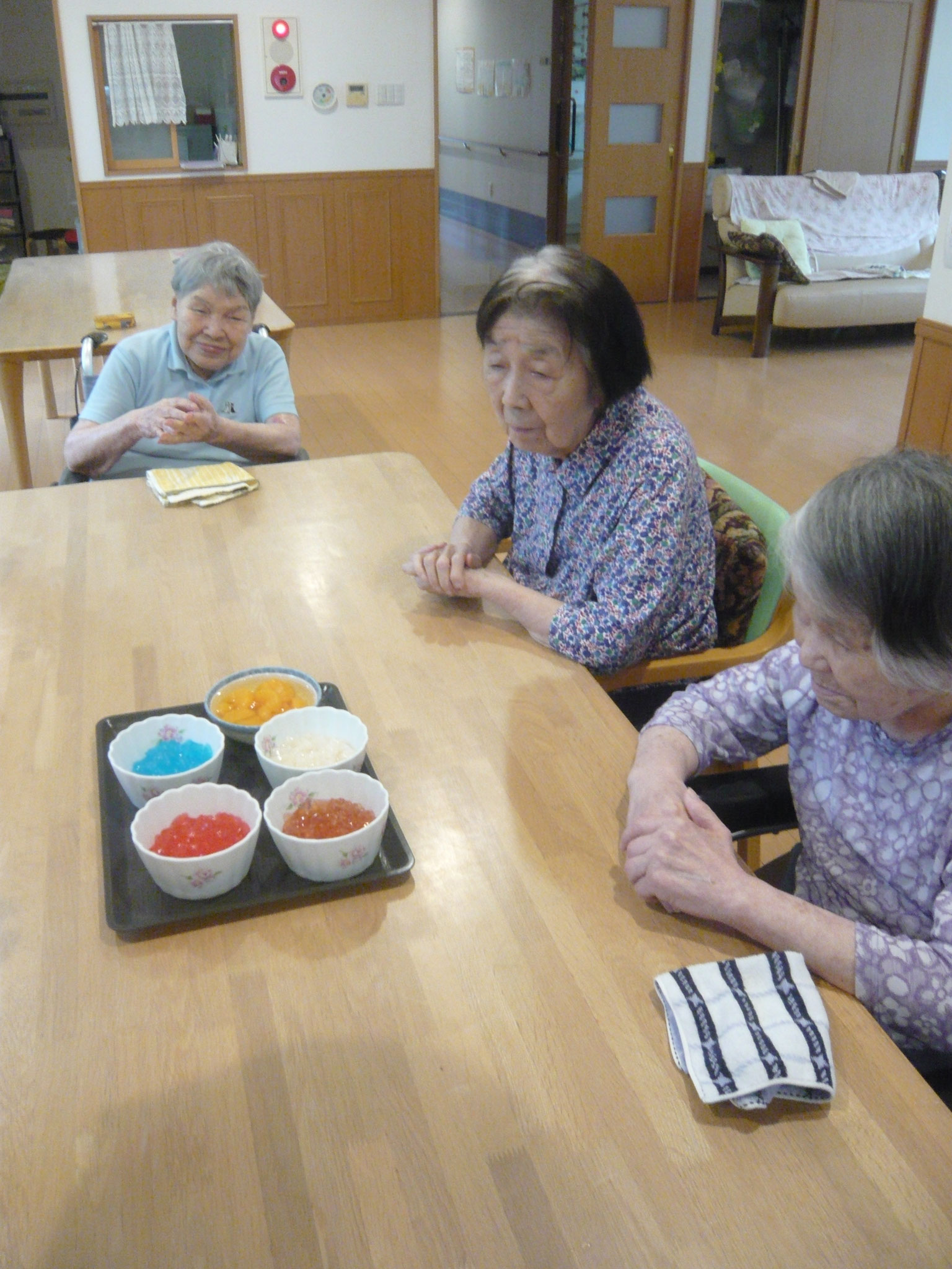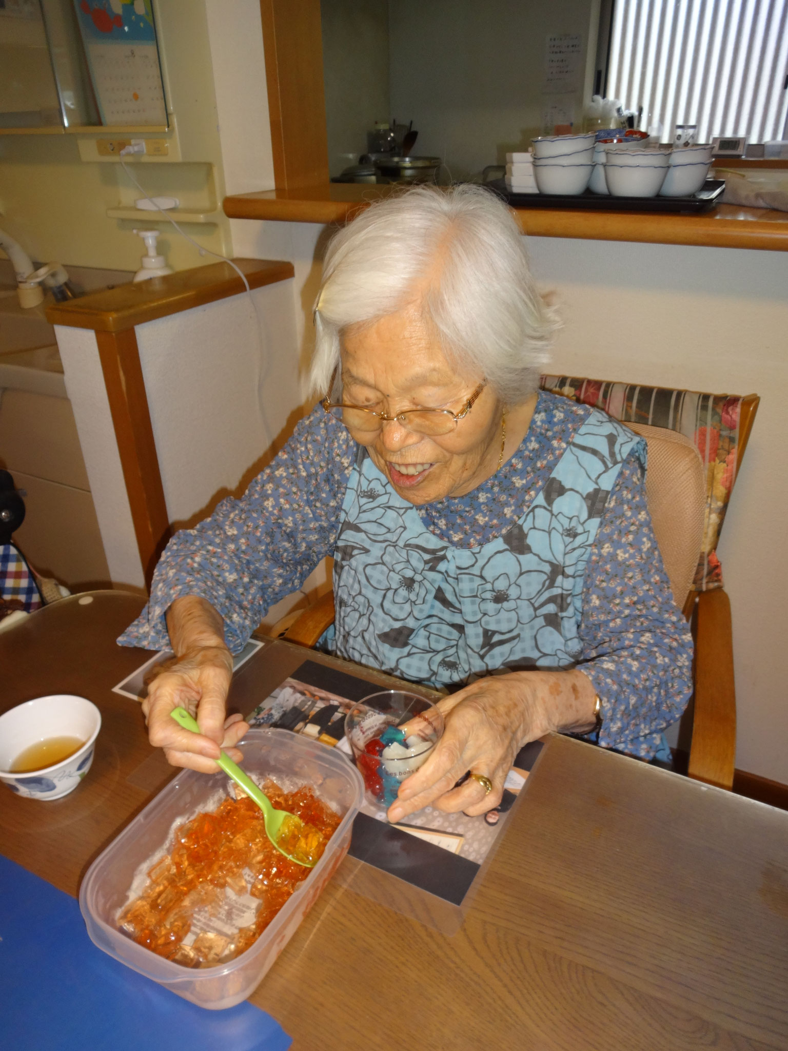 「この色、きれいね」「透き通っとるのが涼しか〜」と、楽しそうに材料を混ぜたり、型に流し込んだりしました。出来上がったゼリーは見た目にも涼しく、大好評でした。