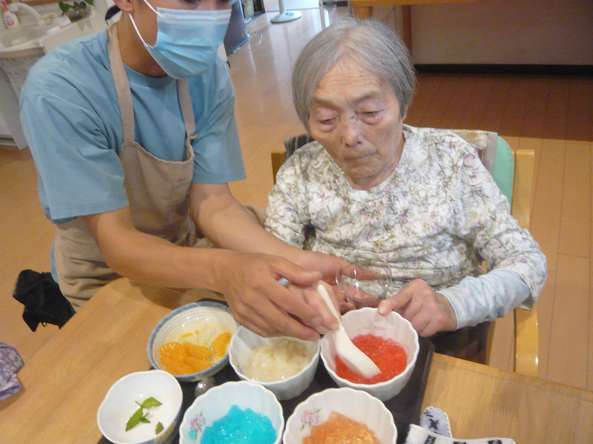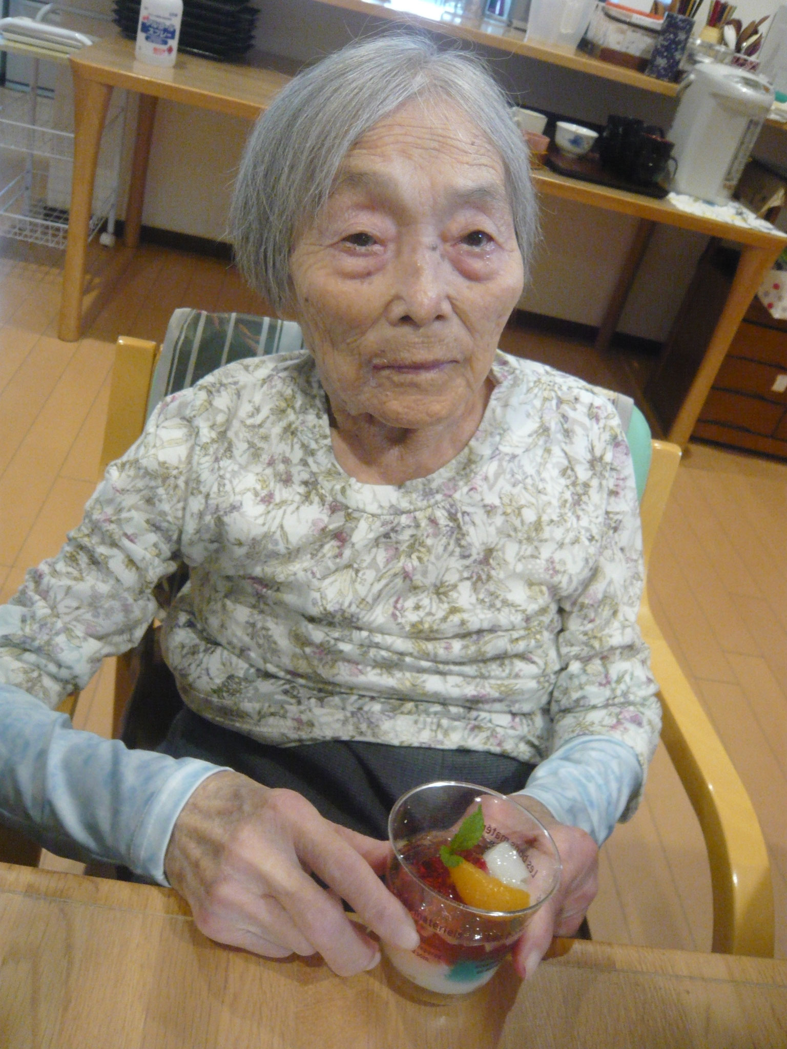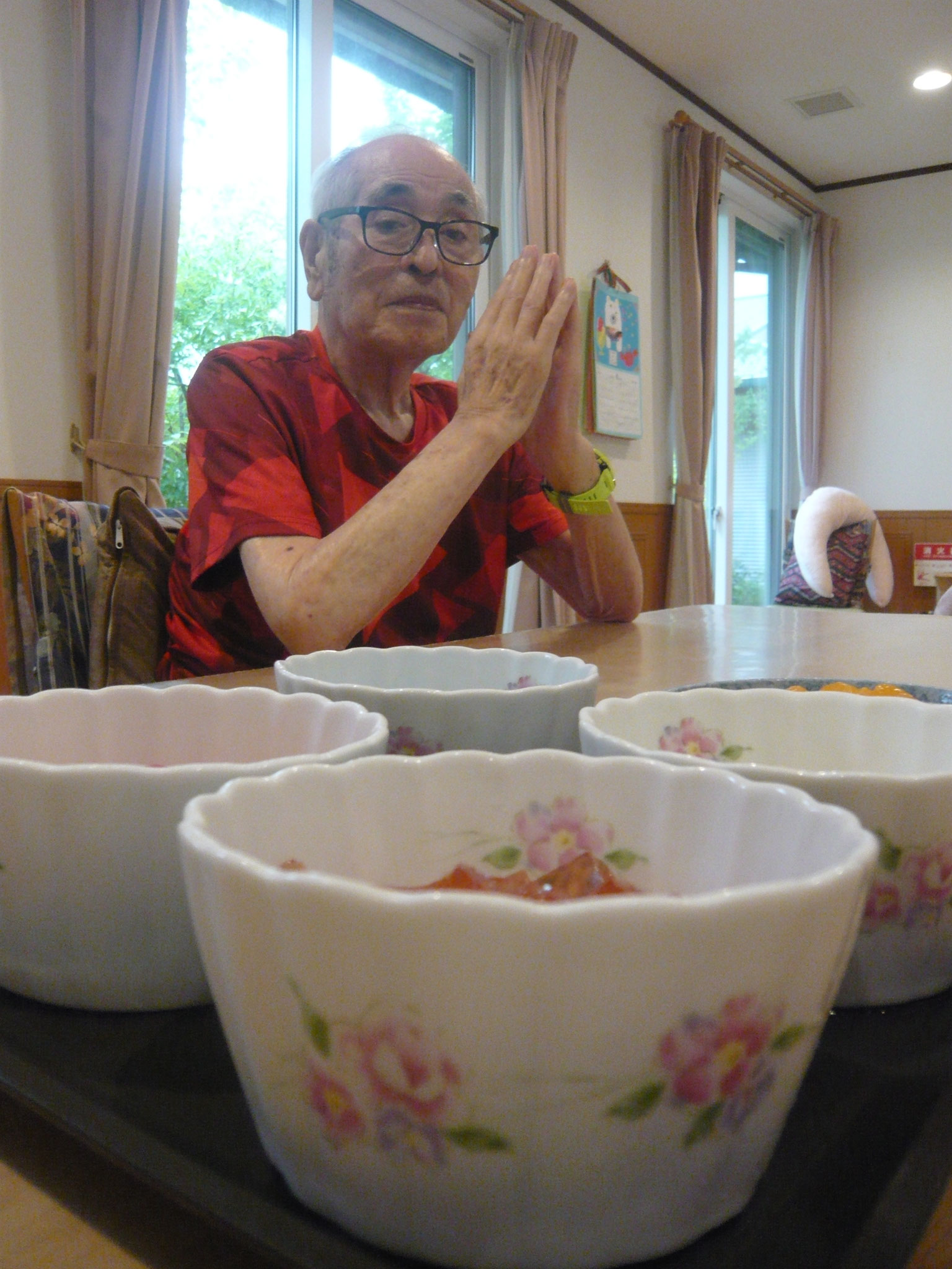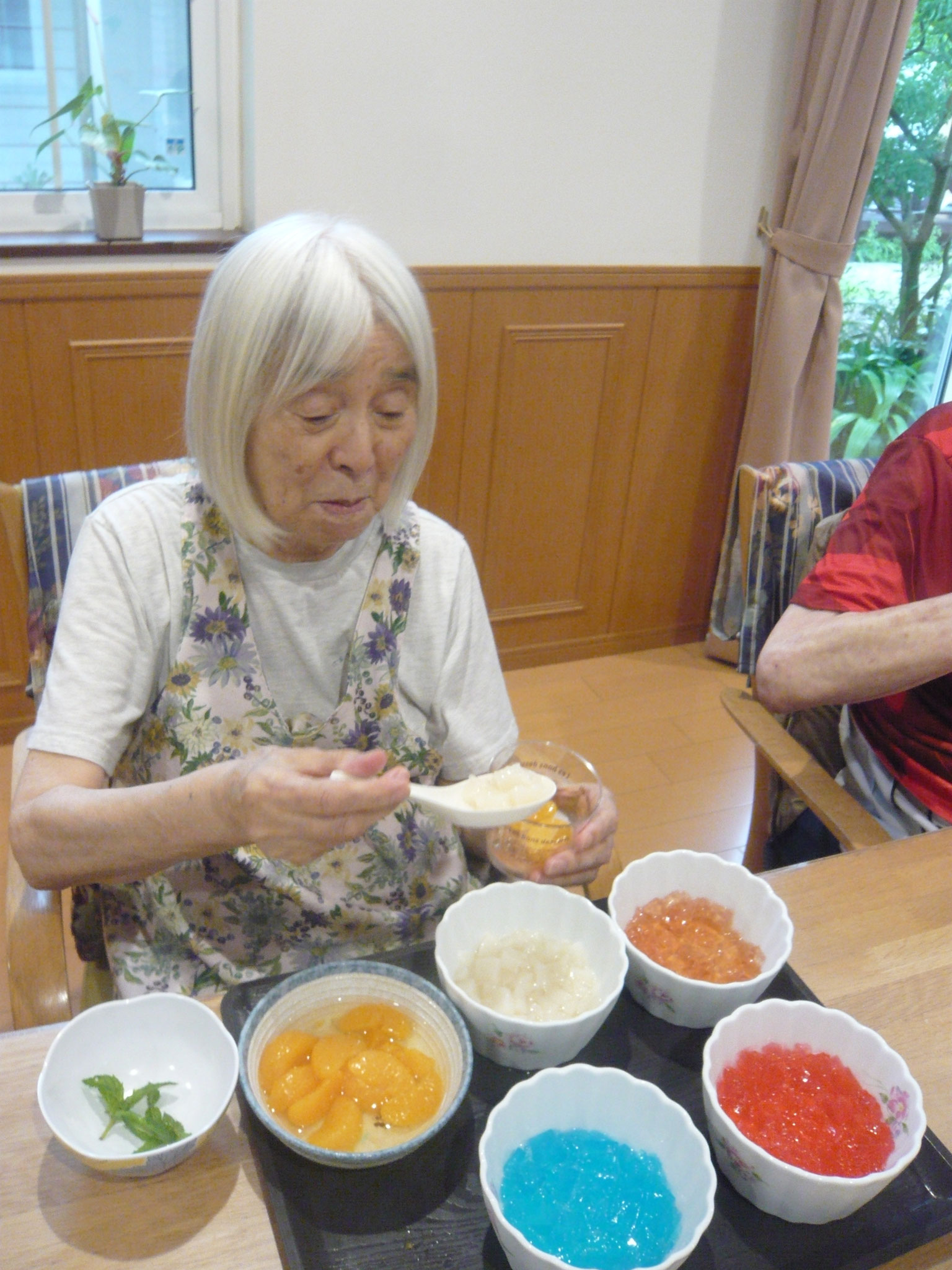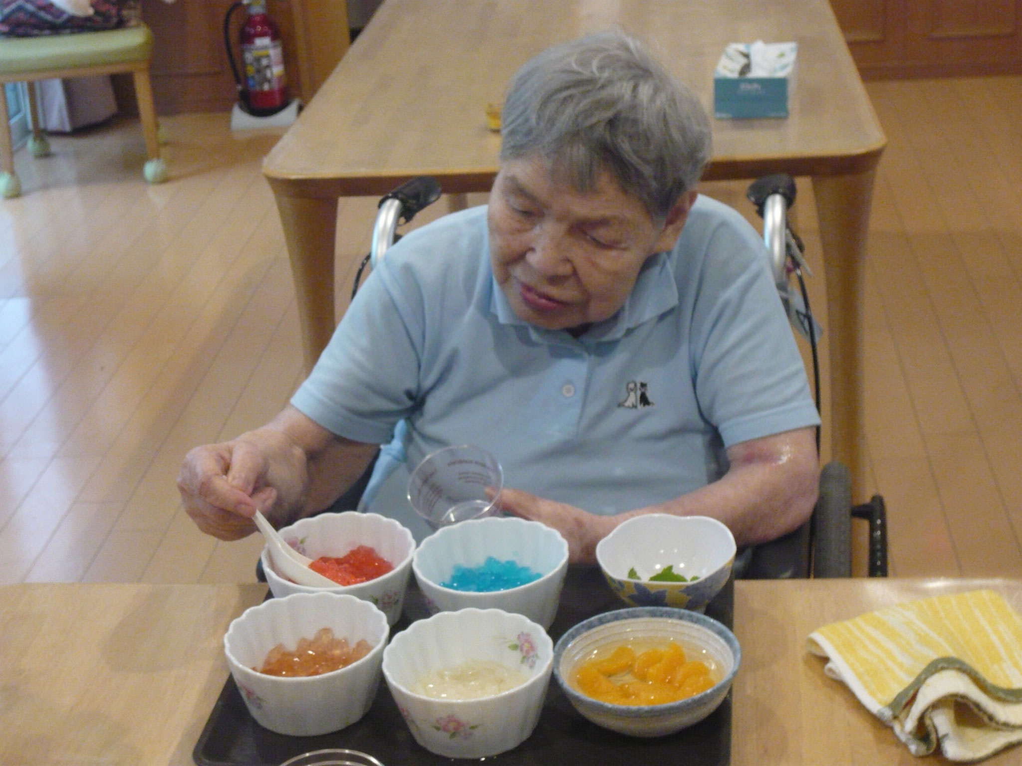 「この色、きれいね」「透き通っとるのが涼しか〜」と、楽しそうに材料を混ぜたり、型に流し込んだりしました。出来上がったゼリーは見た目にも涼しく、大好評でした。