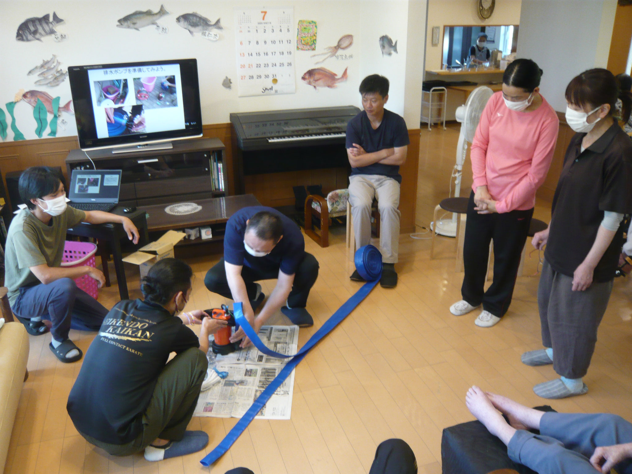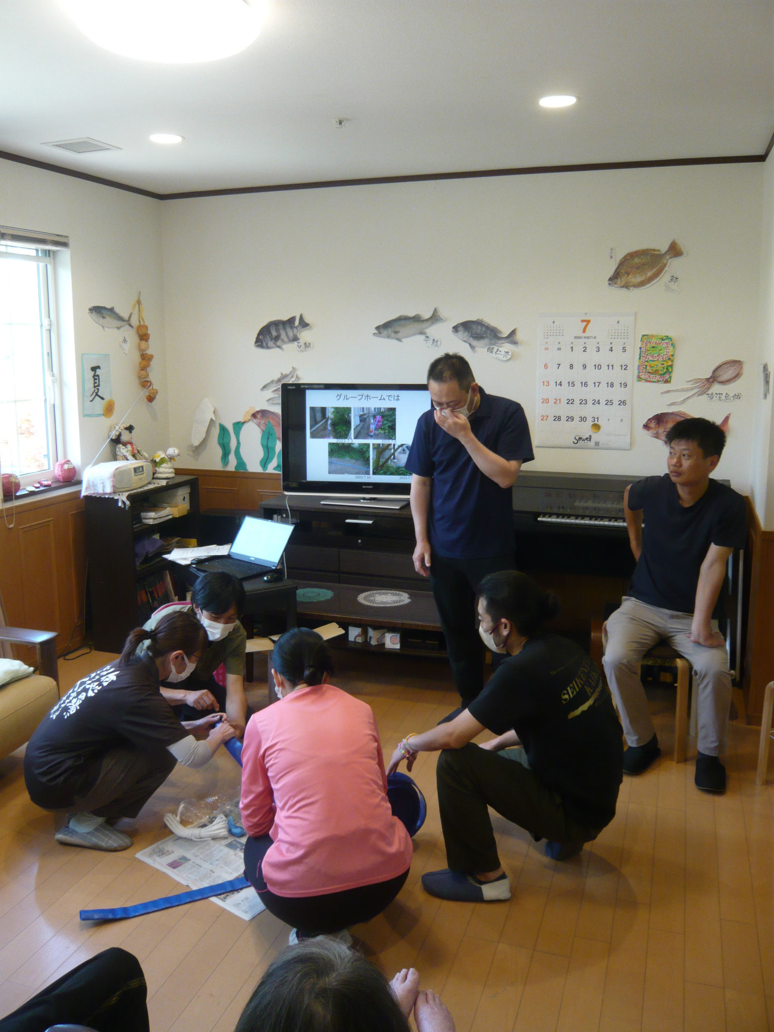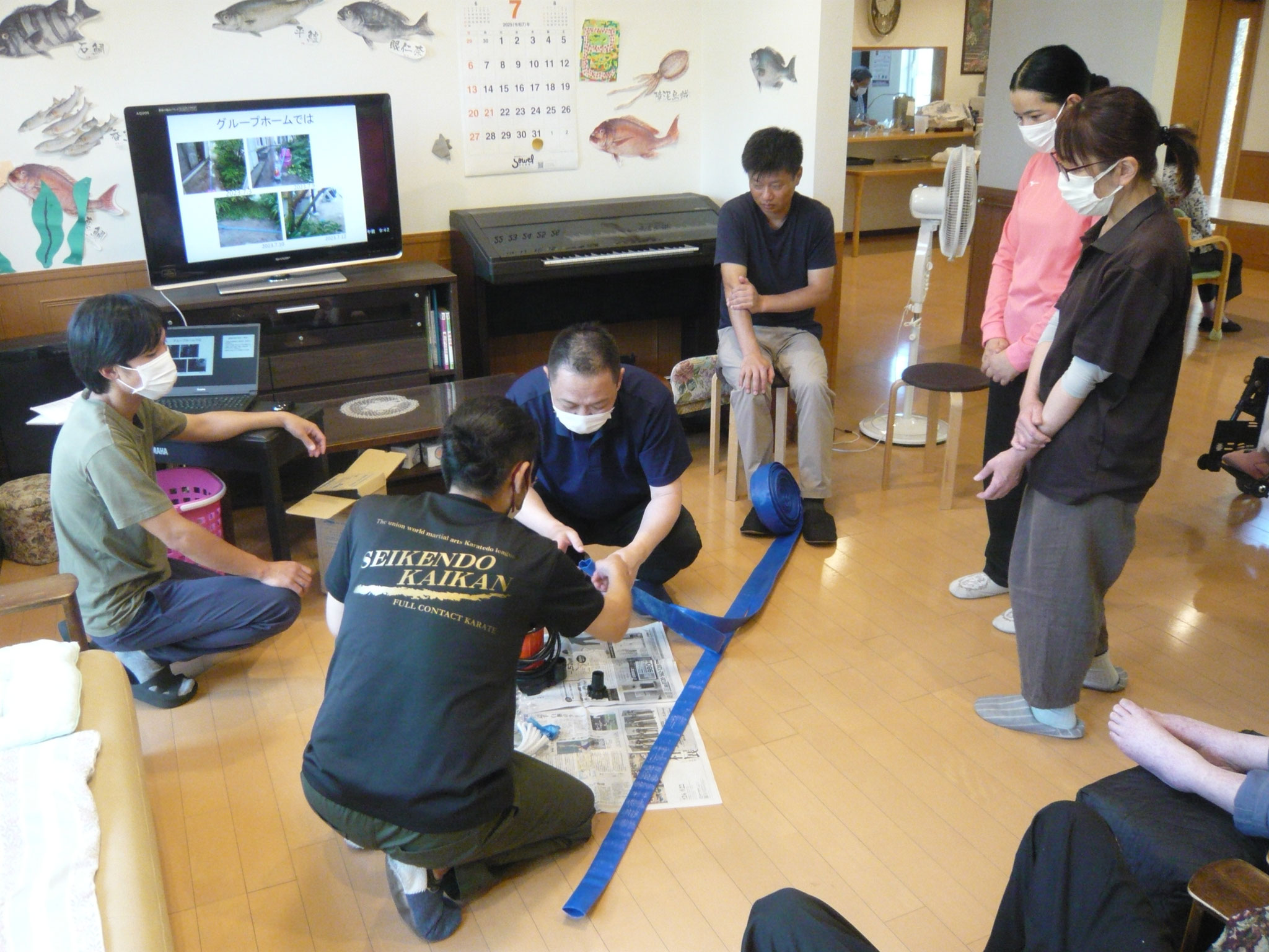 実際に起きた時に落ち着いて対処できるよう、手順をひとつひとつ確認しながら練習。「これで万が一のときも安心やね!」と、利用者さんも職員も心強く感じる取り組みになりました。