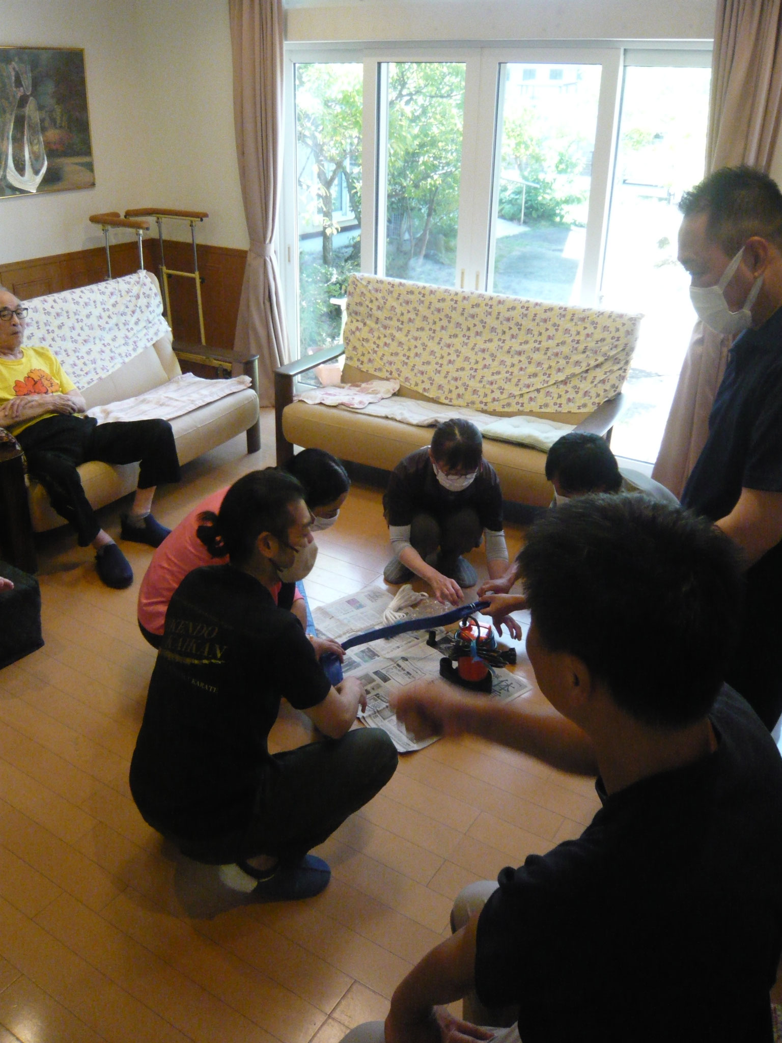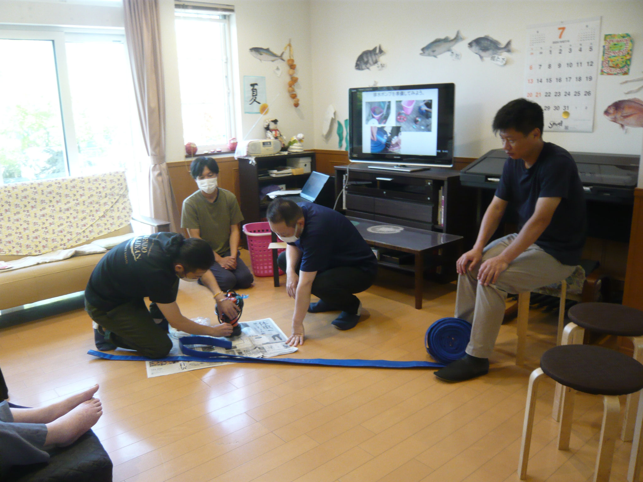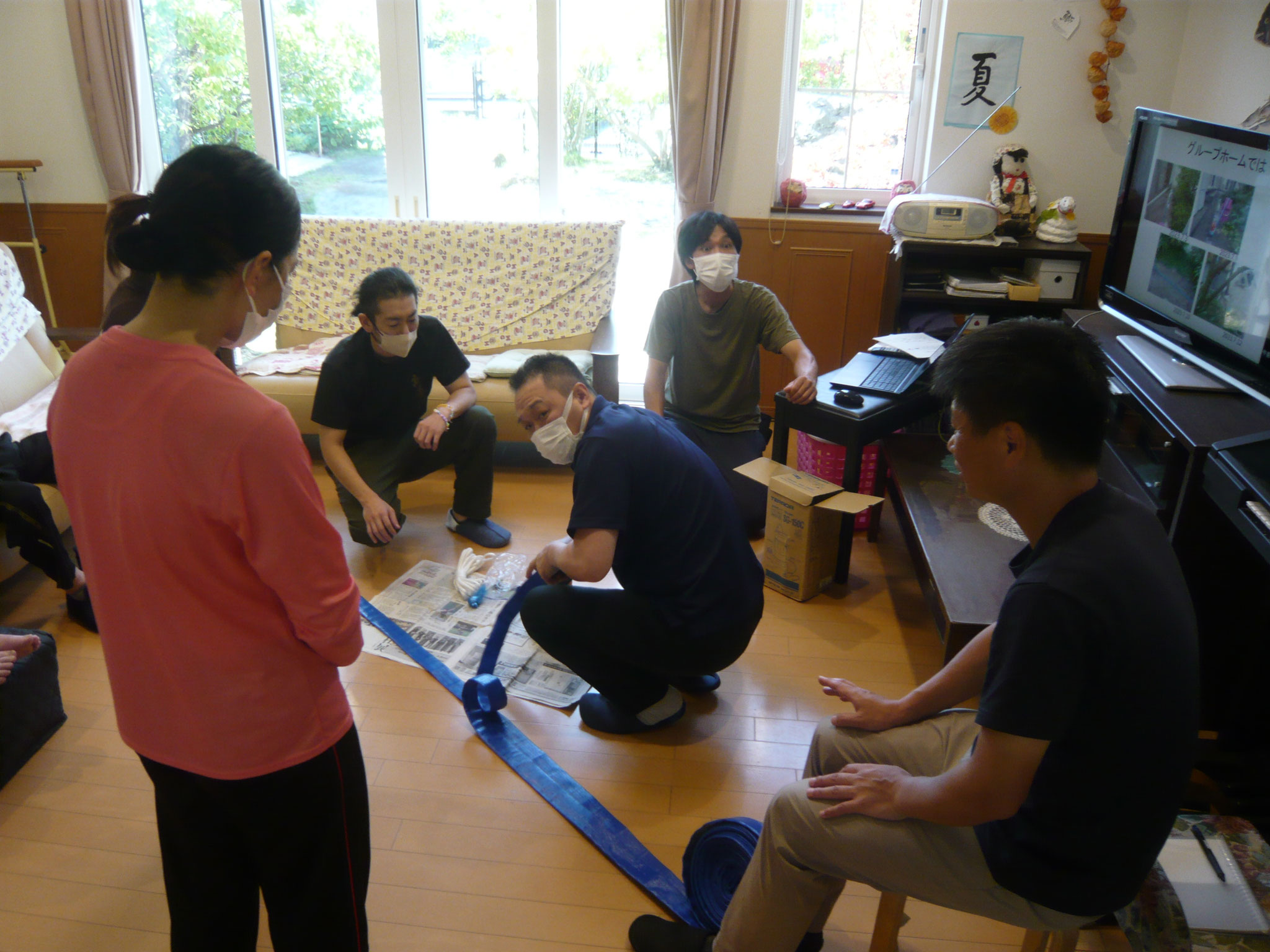 実際に起きた時に落ち着いて対処できるよう、手順をひとつひとつ確認しながら練習。「これで万が一のときも安心やね!」と、利用者さんも職員も心強く感じる取り組みになりました。