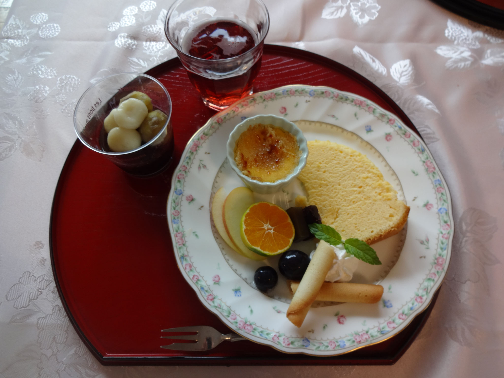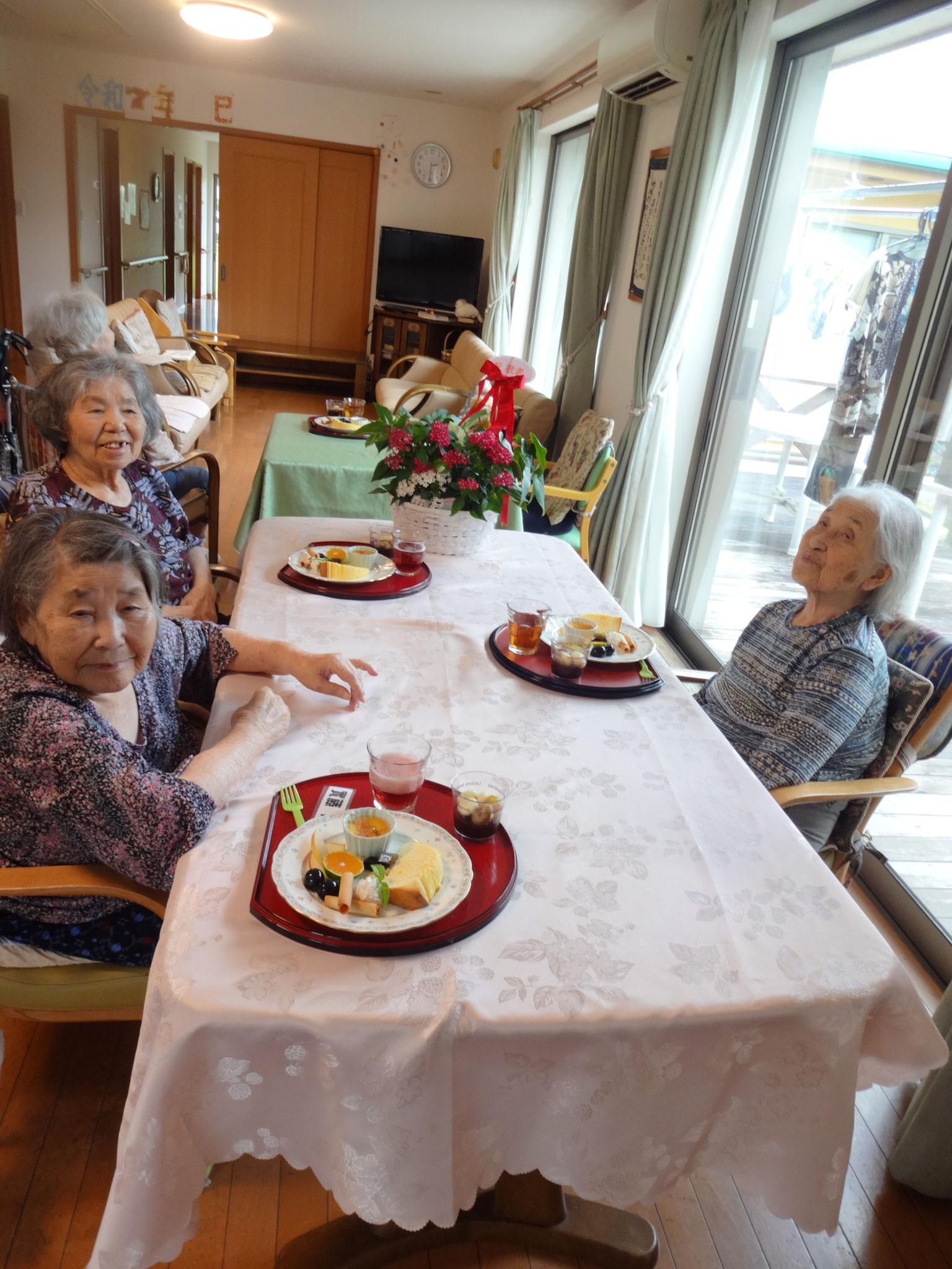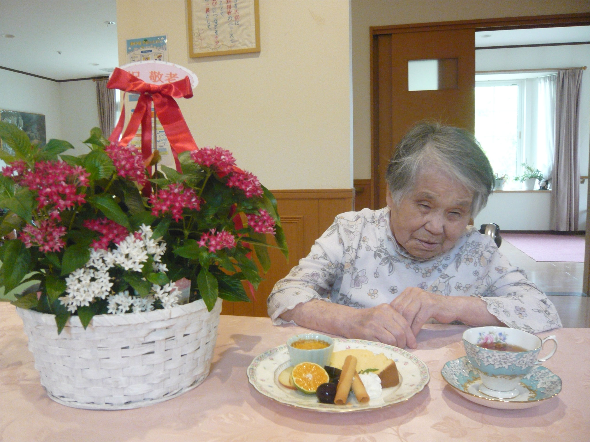 敬老のお祝いとして茶話会を開催しました。カボチャのブリュレなど美味しいお菓子とお茶を召し上がりながら、ゆったりとお話を楽しまれる皆さんの姿は幸せそのもの♪