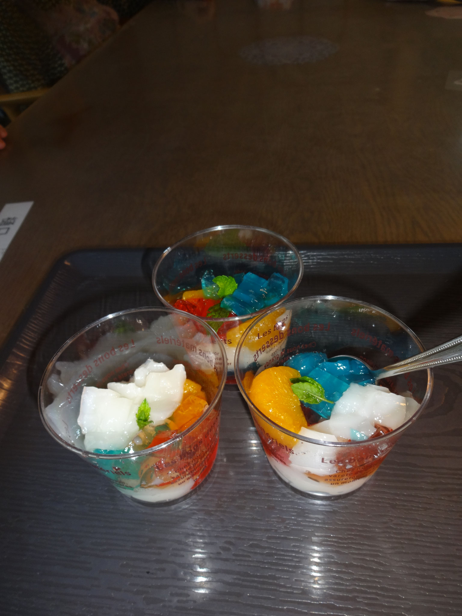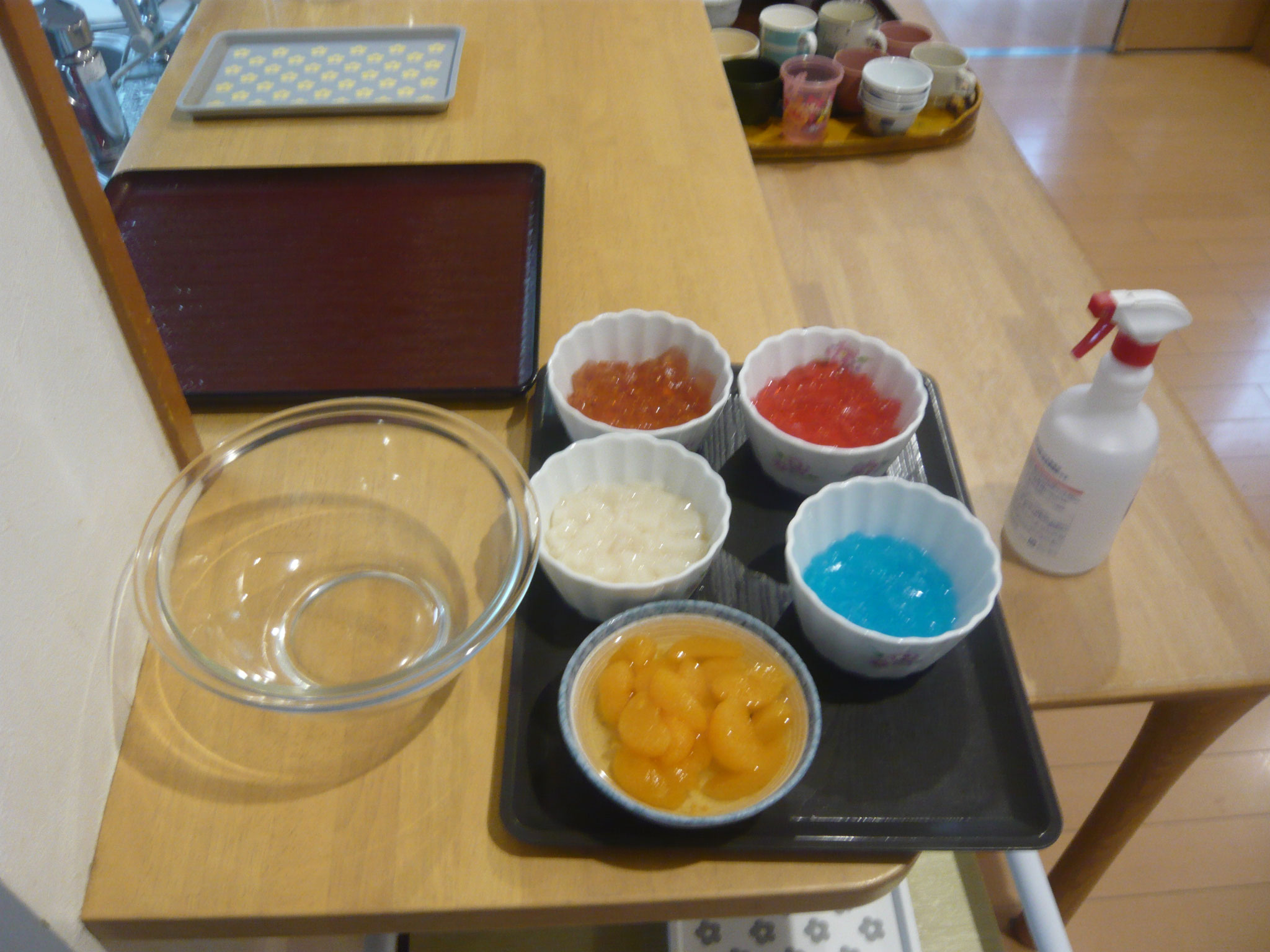 暑さを和らげるため、涼しいおやつ作りに挑戦しました。今回は色とりどりのゼリーを作成!