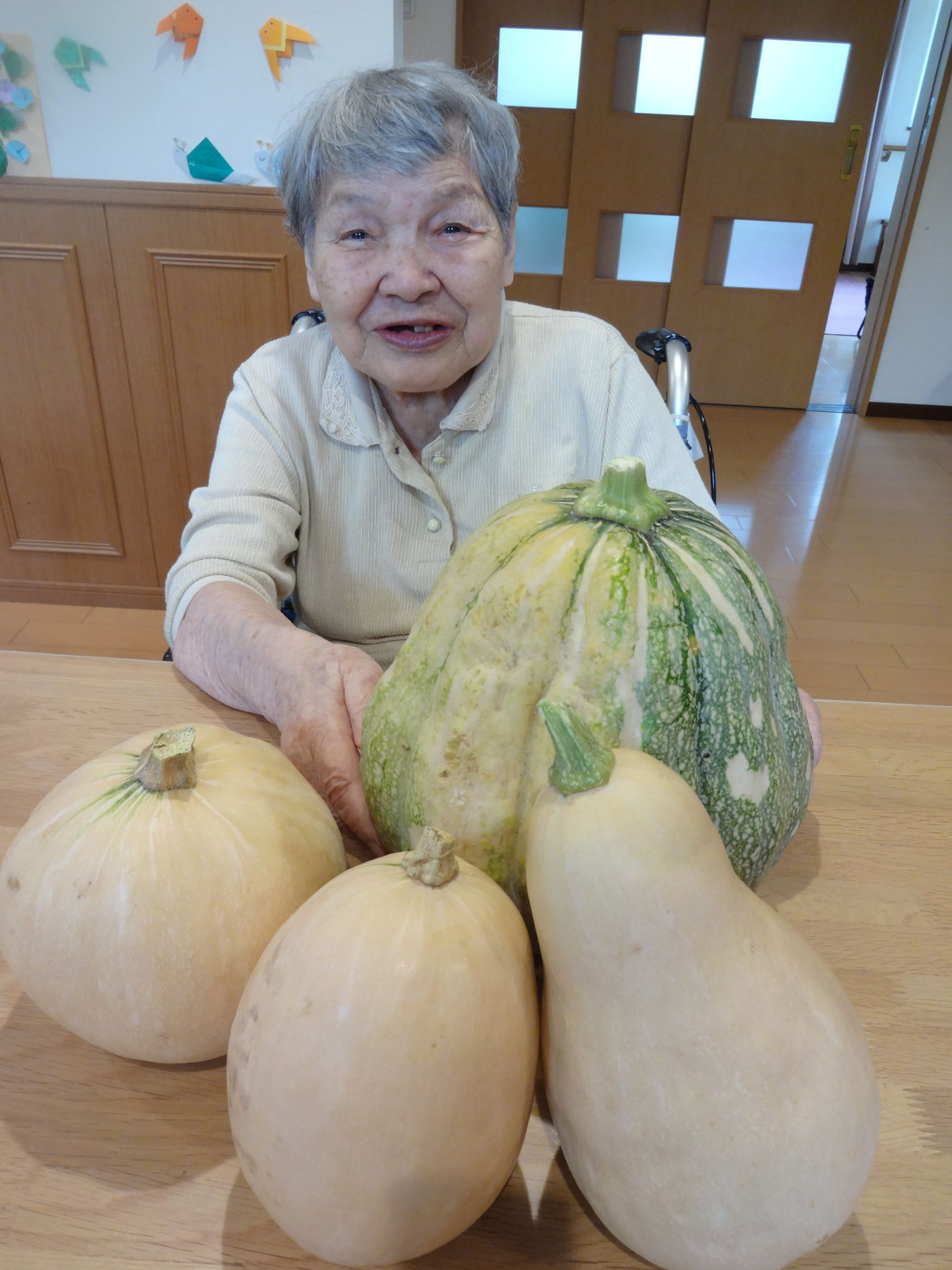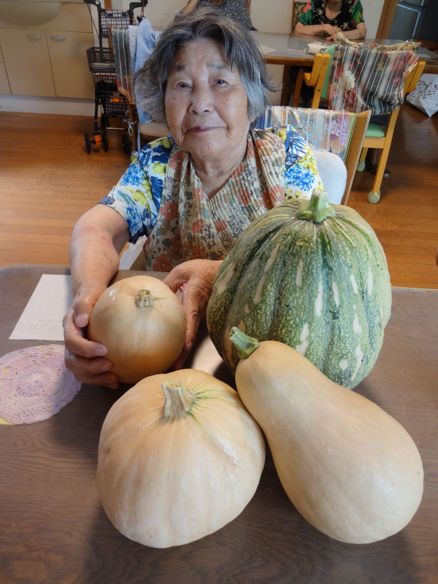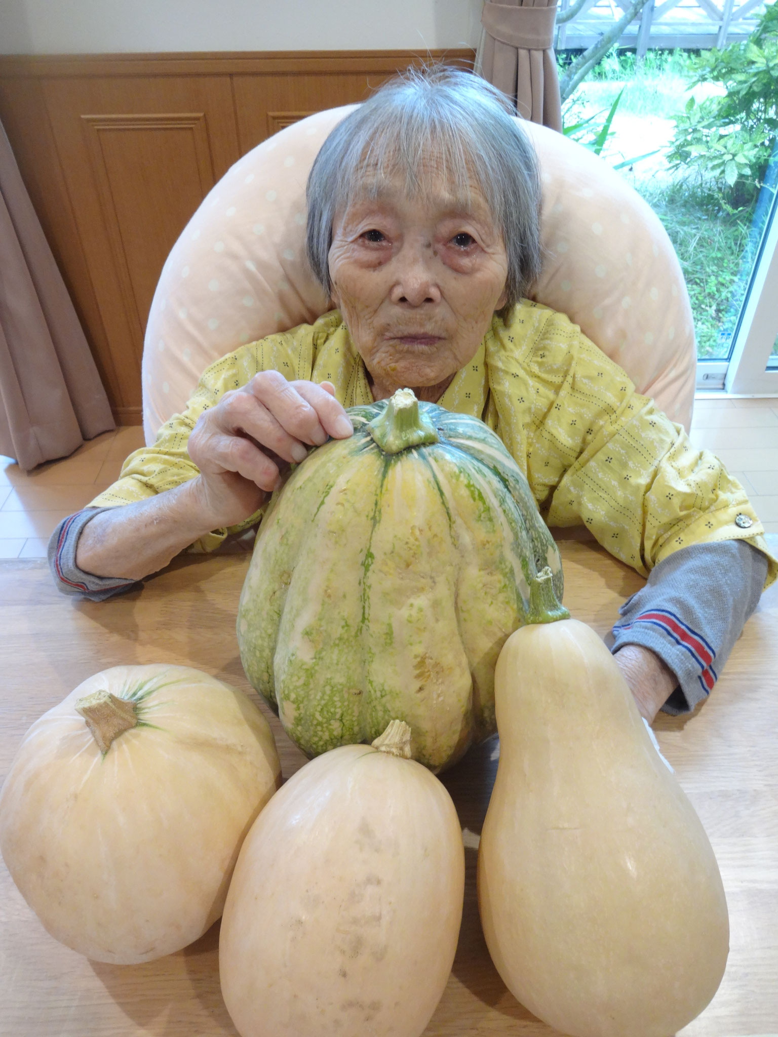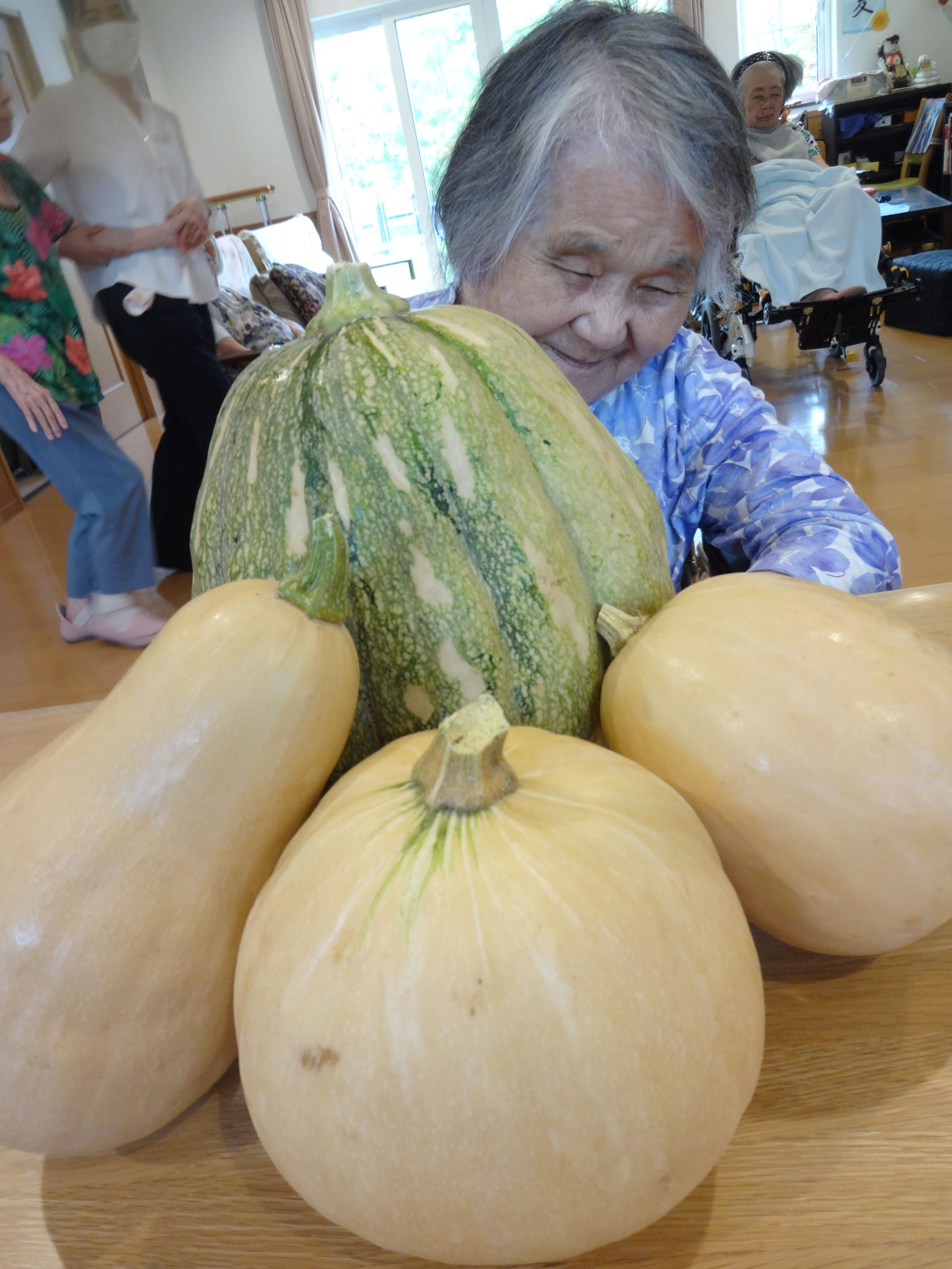 また、ひまわりの貼り絵作りや、頂いた大きなカボチャとの記念撮影も行い、笑い声の絶えない日々となりました。