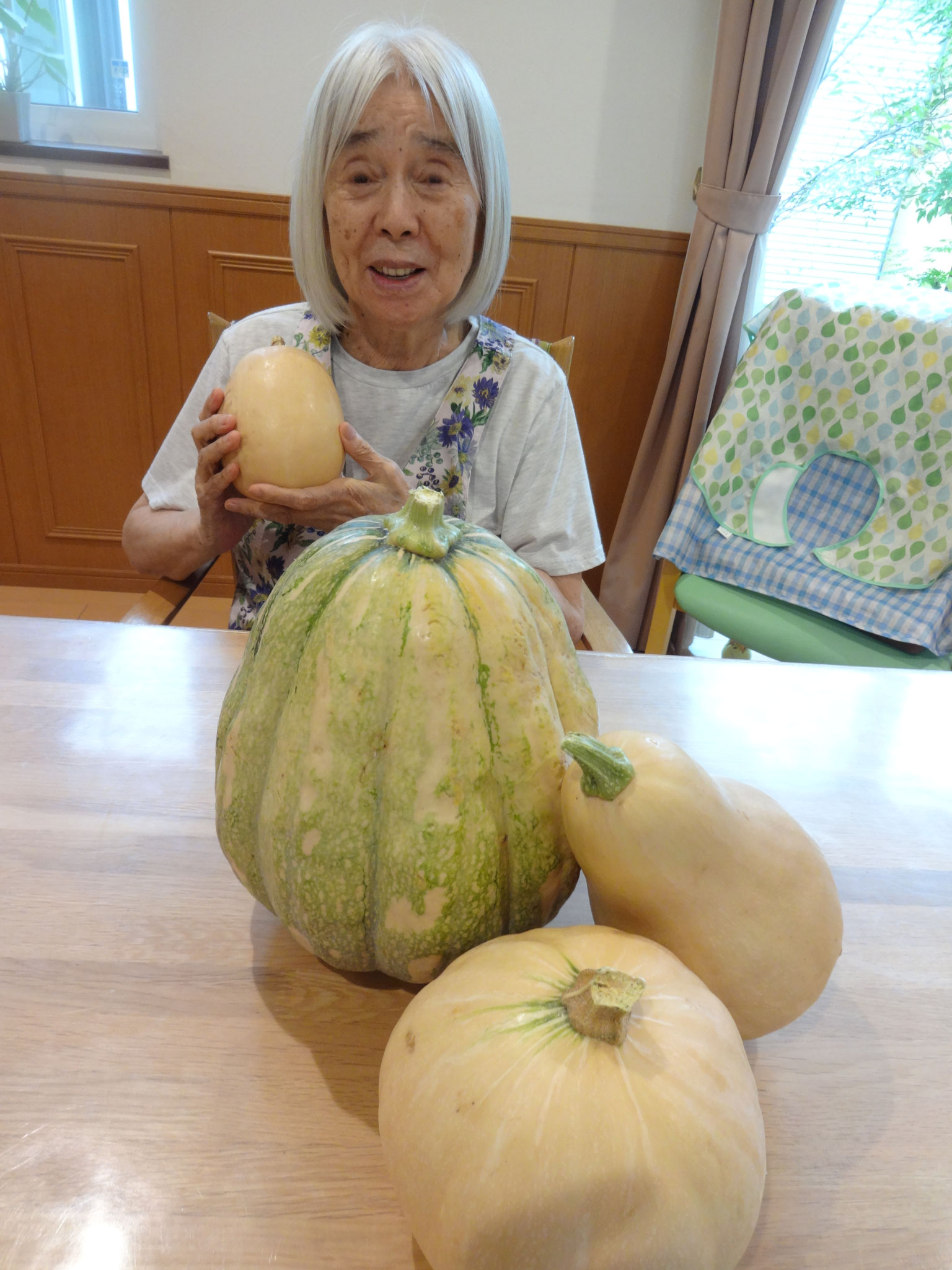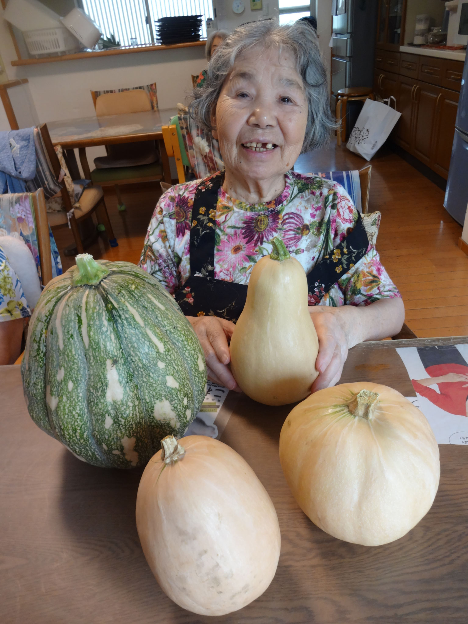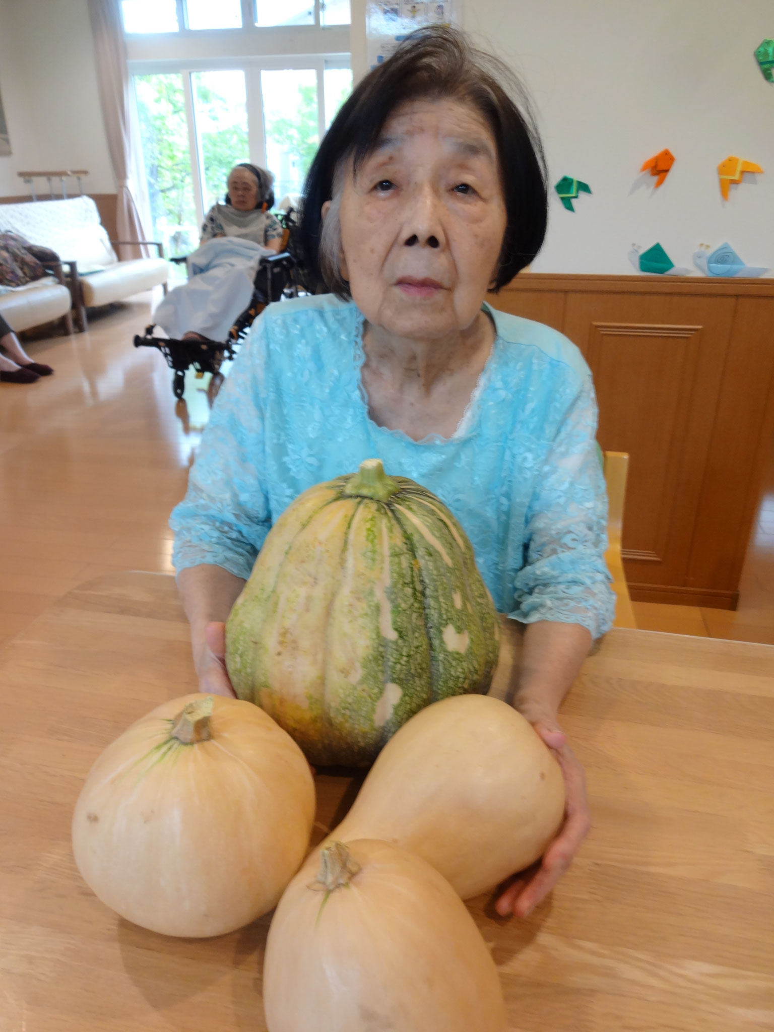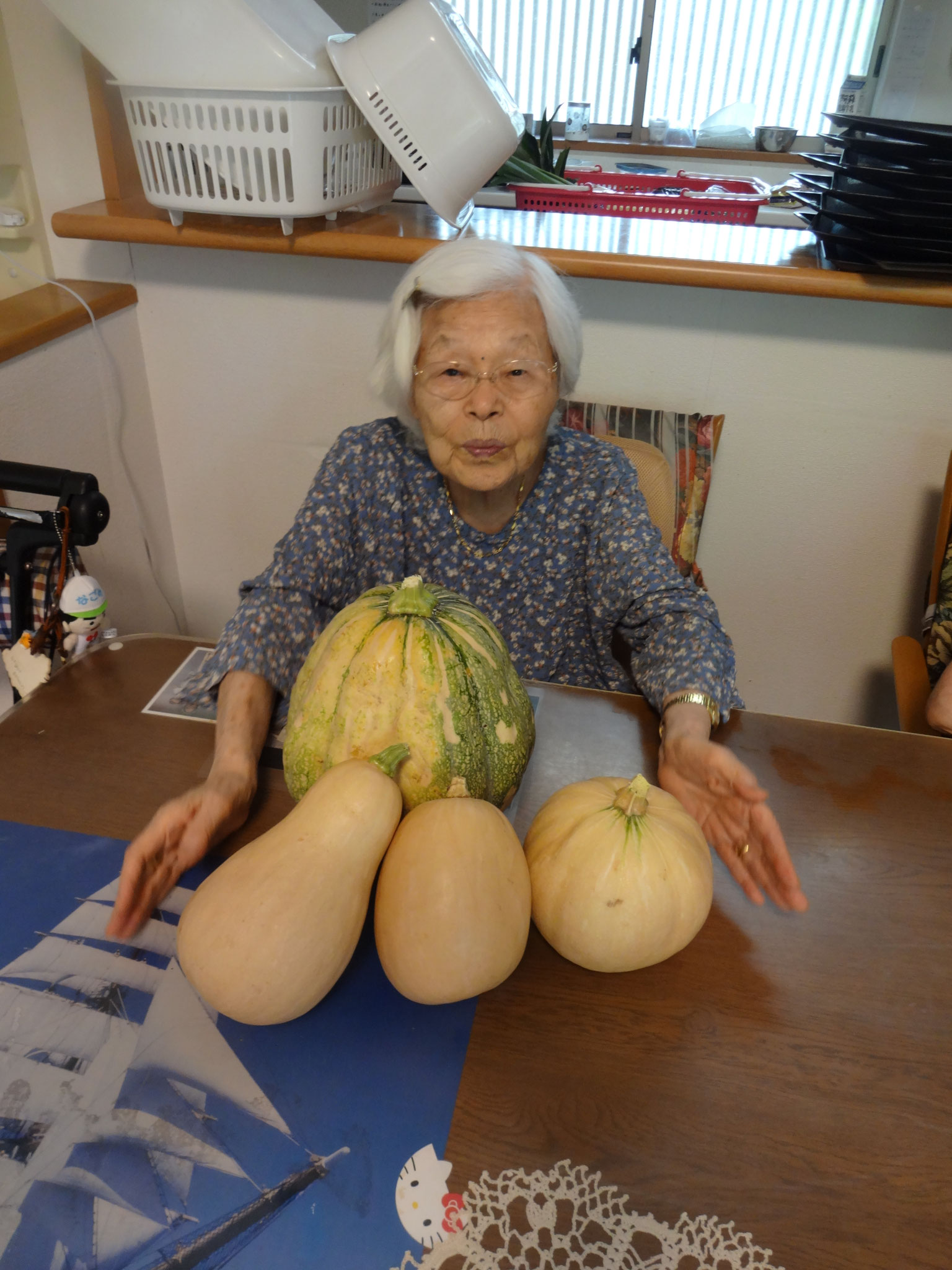 また、ひまわりの貼り絵作りや、頂いた大きなカボチャとの記念撮影も行い、笑い声の絶えない日々となりました。