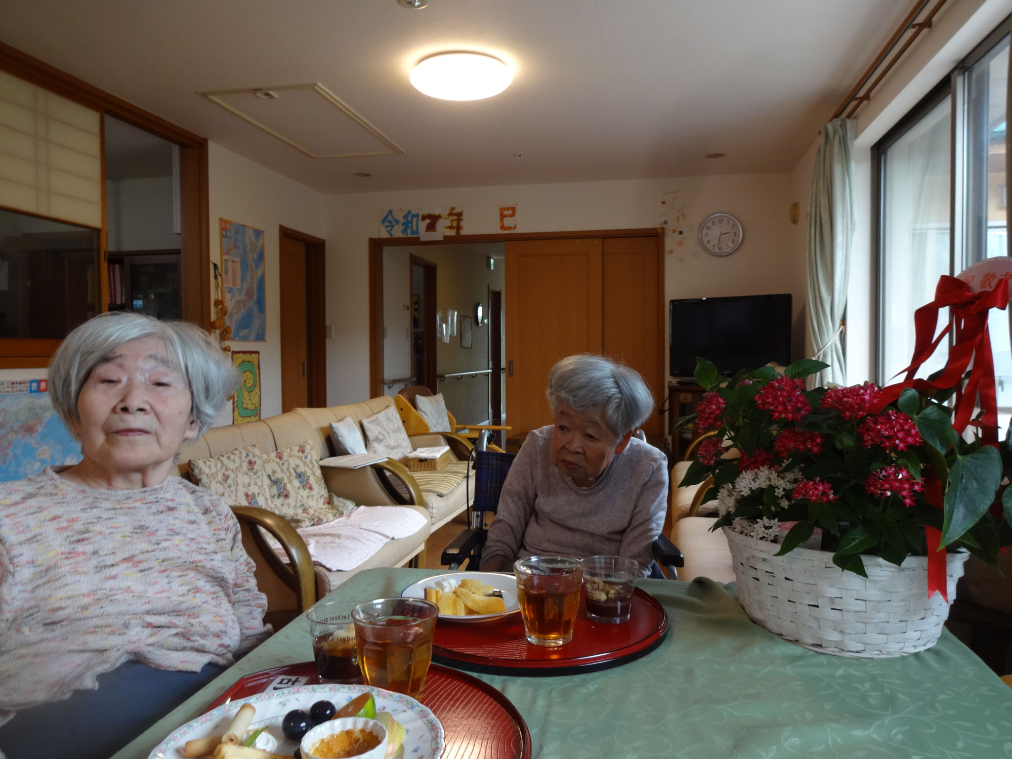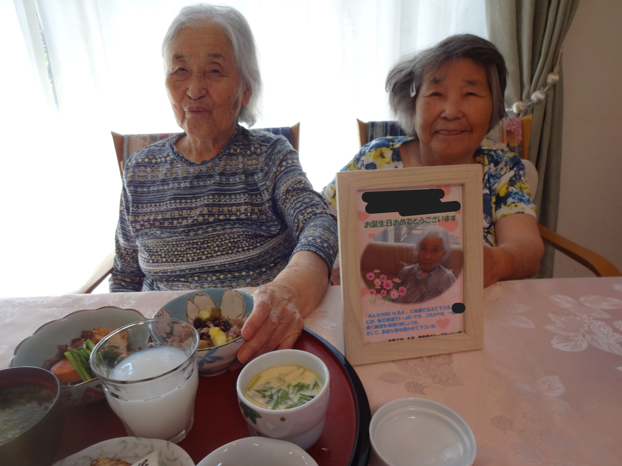 今月は2名の利用者様が誕生日を迎えられました。手作りのカードと歌でお祝いし、美味しい料理を囲んで、にぎやかな誕生会になりました。