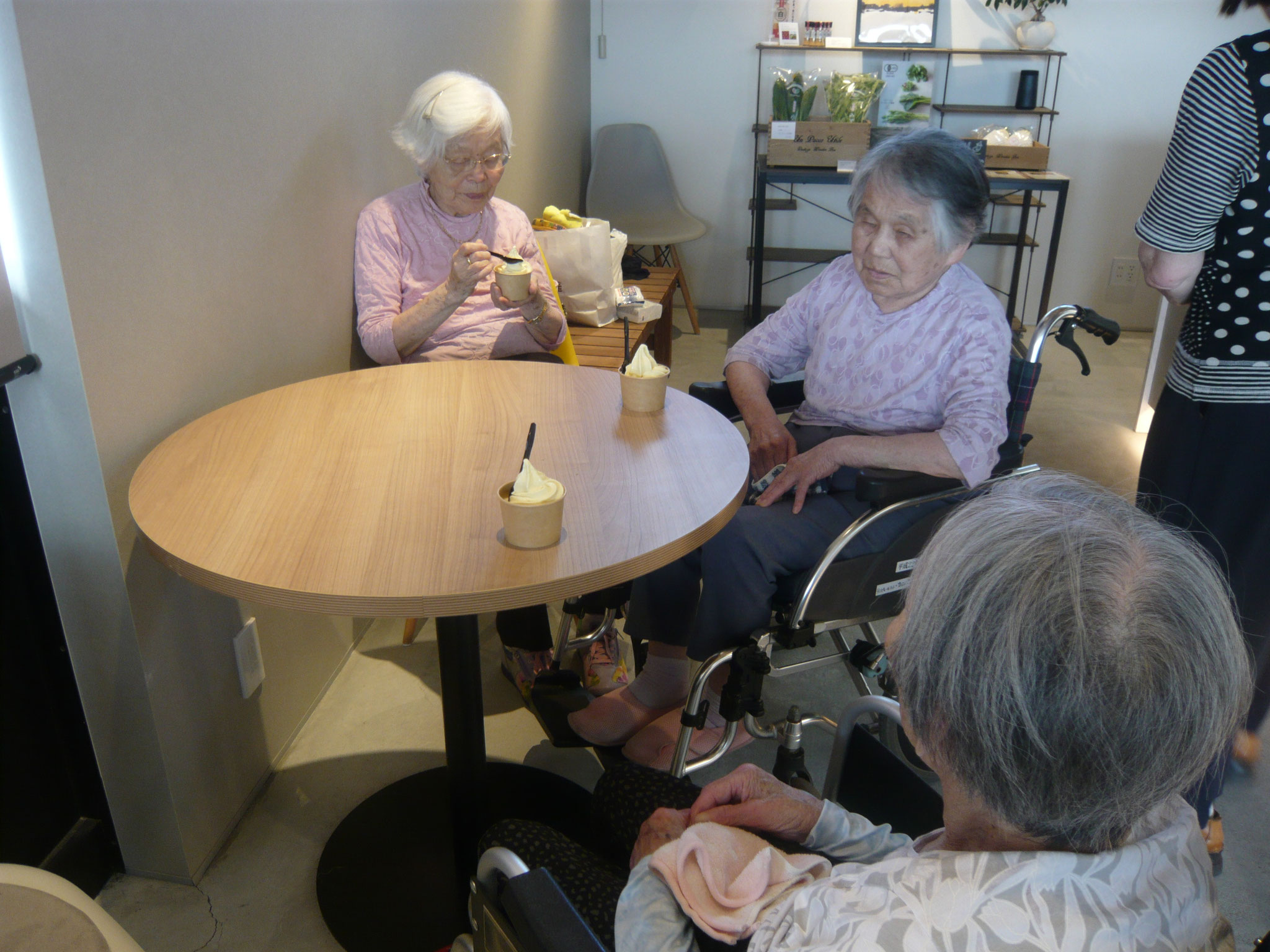 暑い日が続く中、冷たいアイスを求めて外出支援に出かけました。お店に着くと、皆さんどれにしようかと迷いながらも楽しそうに選んでおられました。